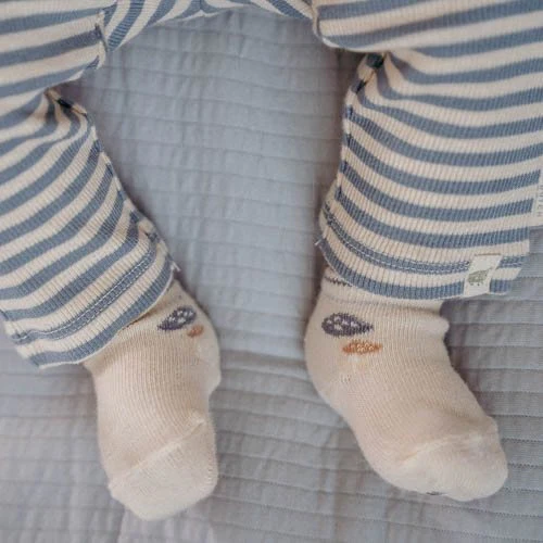 Complete your outfit down to your feet! These cute socks take you on every adventure you can imagine. Choose your favorite pair from three different styles, designed to complete your outfit. Whether it’s a blue and white striped pair, a white pair with two little mushrooms, or a light blue pair with a little fox, there’s a pair for every occasion. The socks are made from soft organic cotton and available in sizes 44/56 and 62/74. Combine with the other items from the Forest Friends collection.