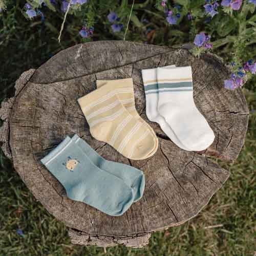 Complete your outfit down to your feet! These cute socks take you on every adventure you can imagine. Choose your favorite pair. There are three different styles to complete your outfit. A green pair with a small beetle, a yellow and white striped pair, and a sporty white one. The socks are made of soft organic cotton and available in sizes 17 – 19, 20 – 22, and 23 – 26. Mix and match with the other items from the Forest Friends collection.