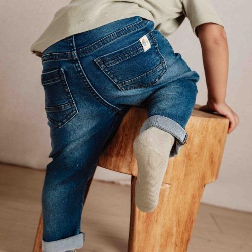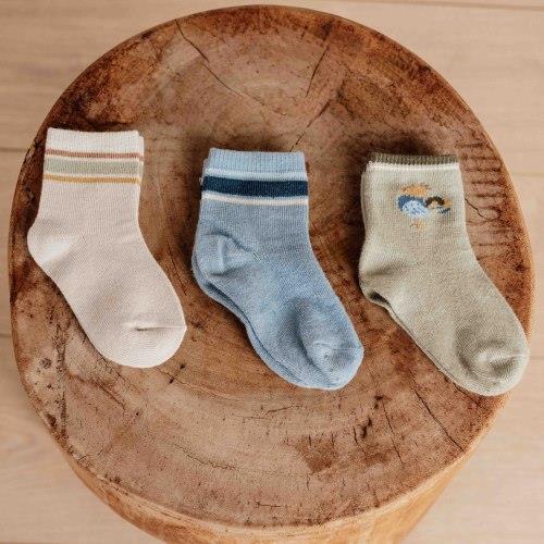 Complete your outfit down to your feet! Choose your favorite pair. There are three different styles to complete your Farm look. A green pair with a rooster, an off-white pair with sporty stripes around the ankles, and a blue pair with text on the side. The socks are made from soft organic cotton and available in sizes 17 – 19, 20 – 22, and 23 – 26. Mix and match with the other items from the Farm collection.