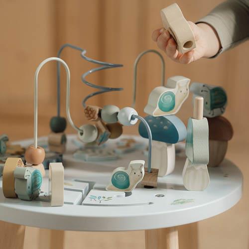 Get up and play! Discover all the activities that this table has to offer. Bring the beads from one side of the spiral to the other through the enchanting forest. Or build a block tower and fill the forest with nice trees. Make the puzzle, turn the gears and move the animals through the Forest Friends environment. This wooden activity table challenges your little one in many ways. There are 5 activities to discover, each supporting the development of fine motor skills. Thanks to the safe and balanced design, the activity table also stimulates getting up. And stay standing! Because all those playing functions will keep your toddler busy for a while. To be mounted by an adult.