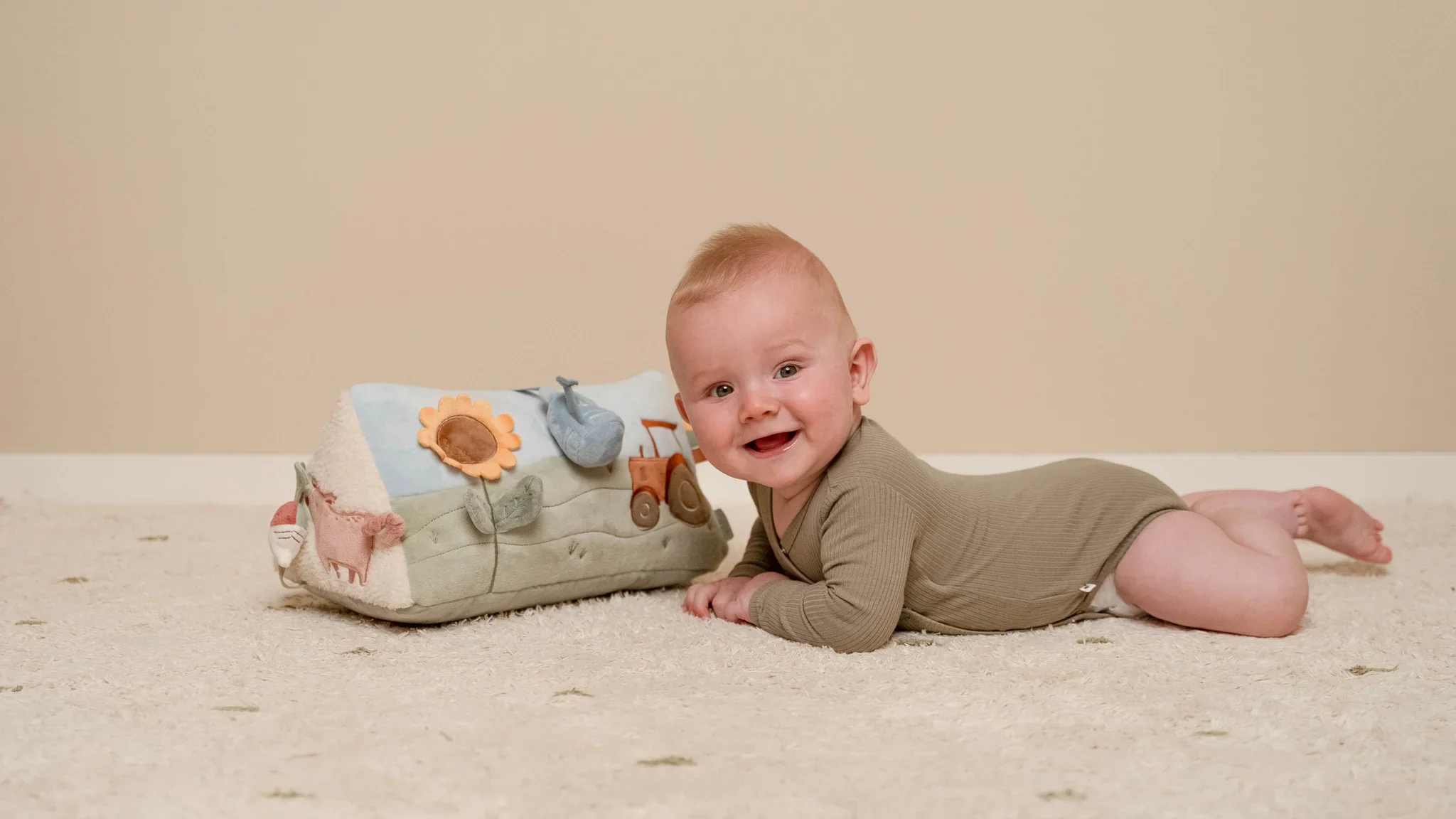 This versatile activity triangle takes small children on an adventure while they lie on their stomachs. Along the way, there is much to discover. From the crinkling wings of the chicken to a little mirror and a rattling watering can. The product has playful features and fun textures that stimulate your baby’s senses and imagination.
