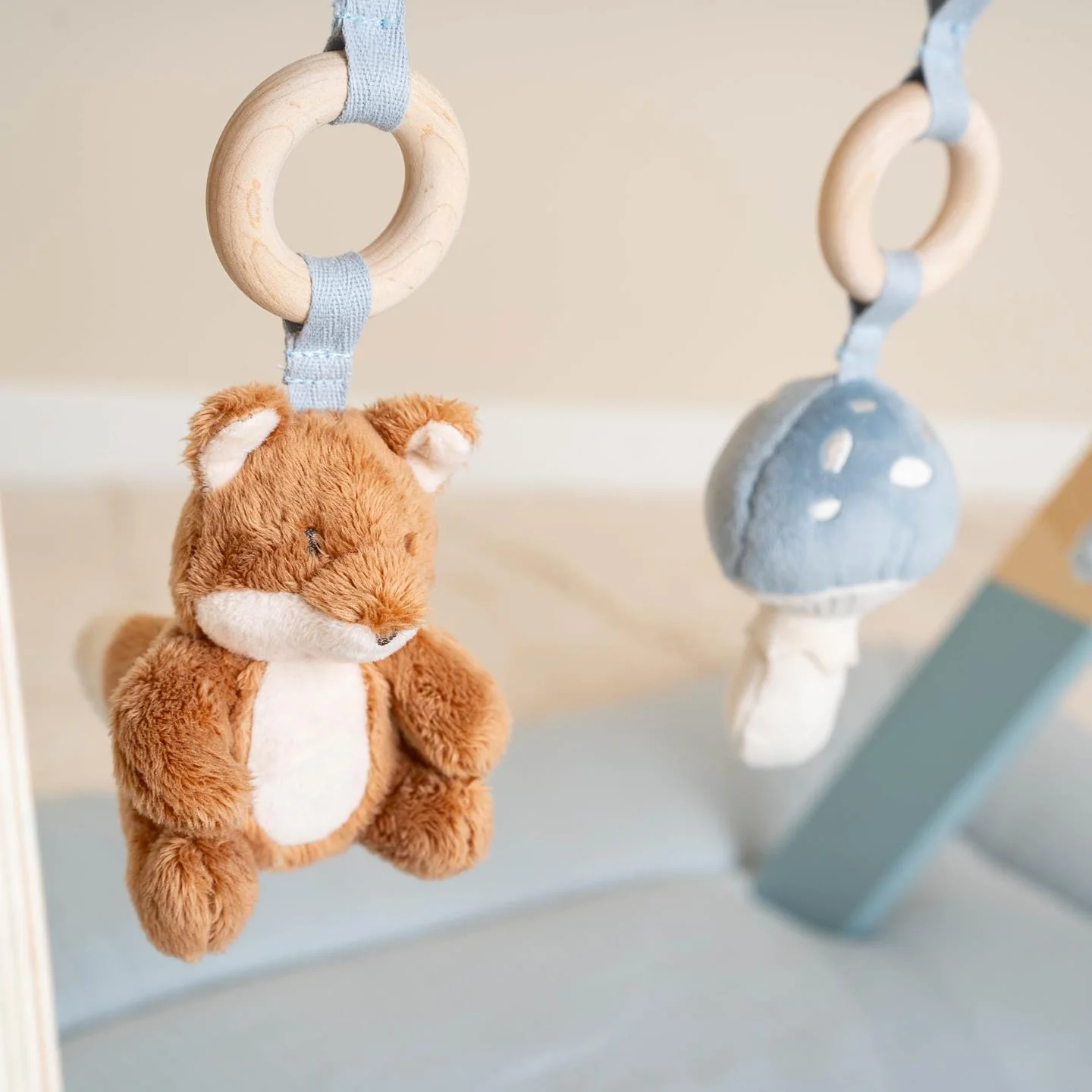 Up with those little arms! Curious babies have a great time with this wooden baby gym. There are three different activity toys that provide entertainment: a cute fox, the wise owl, and a mushroom. The baby gym develops hand-eye coordination, improves motor skills, and stimulates the senses every time your little one reaches for one of the toys. WARNING: To prevent the child from getting entangled and injured, remove this toy when the child starts crawling on hands and knees. To be assembled by an adult.