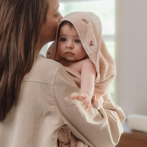 Wrap your little one in warmth and softness with this bath cape. Made from 100% organic cotton terry cloth for a wonderfully soft and cozy feeling. Designed for both practical use and charm, the soft hood ensures security and comfort after bathing. The towel has a beautiful light pink blossom color and the hood is decorated with cute embroidered flowers from the Fairy Garden collection.