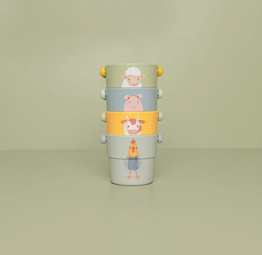 Stack, fill, pour, and SPLASH! Your little one will enjoy bath time even more with this set of 4 bath cups. They come in 4 different colors and are decorated with the cutest farm animals from the Little Farm collection. There is a bath cup with a sheep, pig, cow, and a rooster. The size is just right for small hands, and playing with the little buckets helps develop motor skills. Stack them on top of each other to build a big tower or knock them over. Or fill them with water and watch different shapes flow out.