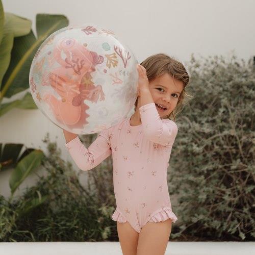 Are you coming to play on the beach? The beach ball is easy to inflate and provides hours of fun. Inside the transparent ball is a seahorse. Done playing? Let the beach ball deflate and it is easy to store again. The inflatable beach ball has a size of 35 centimeters.