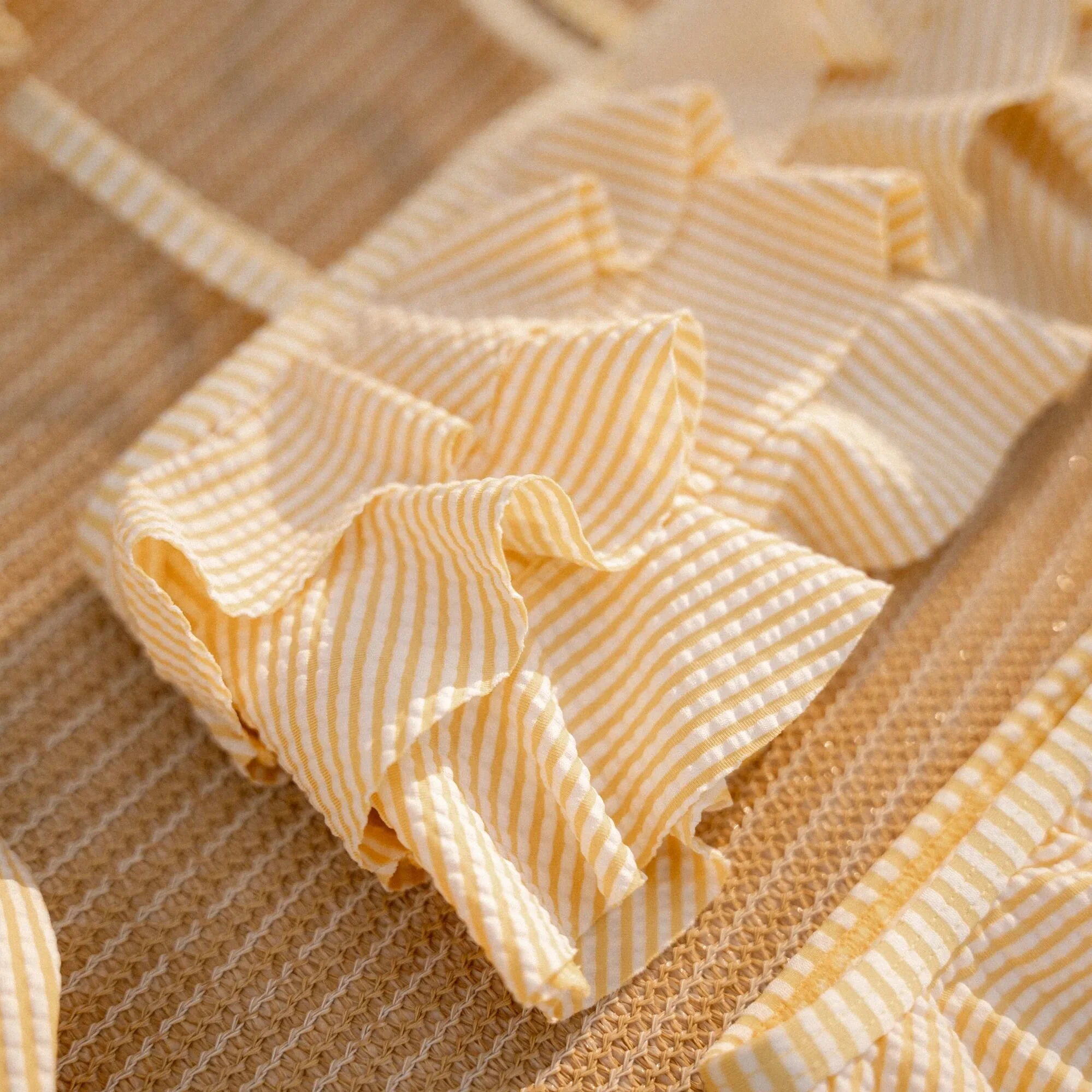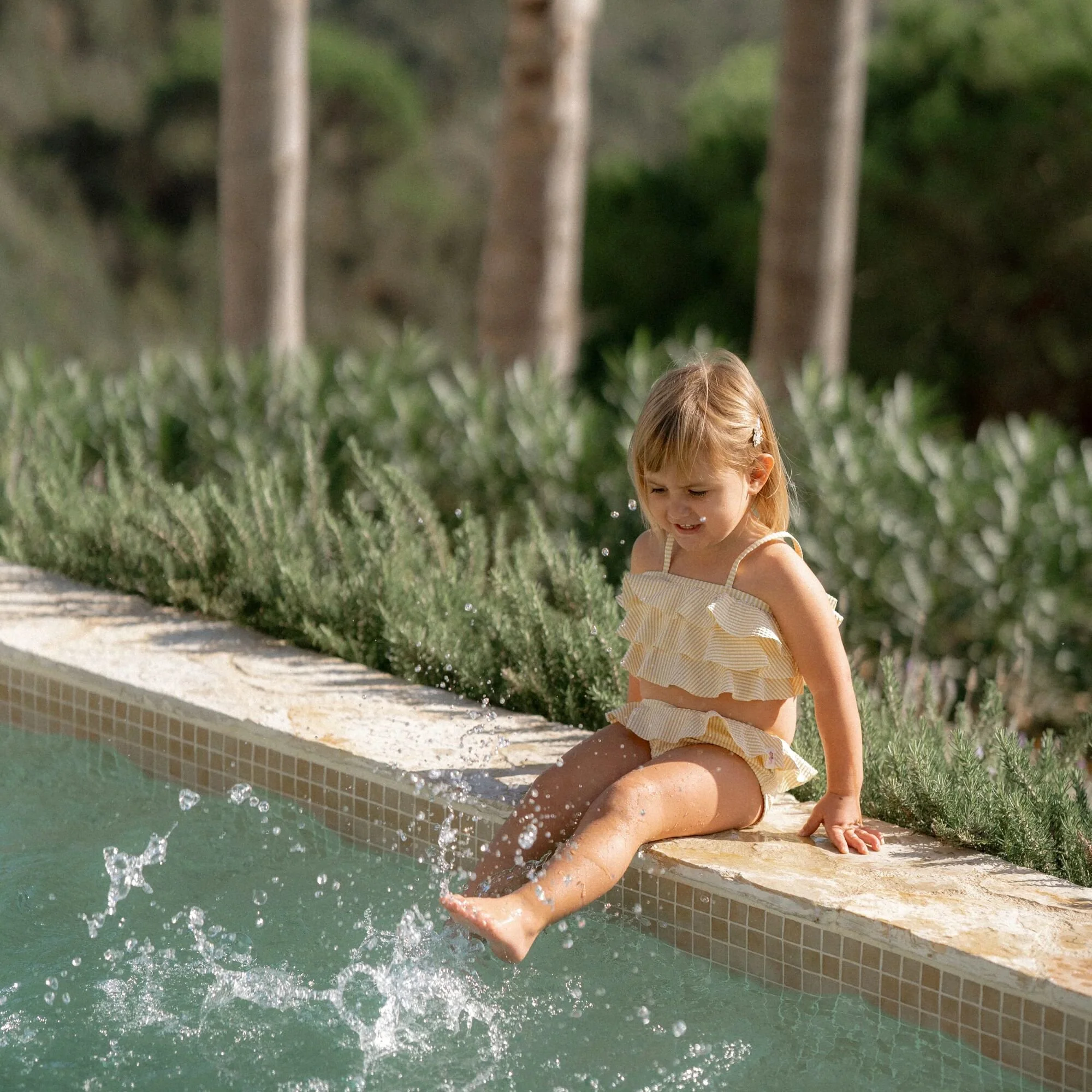 Swimming or strolling?! This two-piece bikini with ruffles is perfect for both! The fit is comfortable so you can swim and play in it all day long. The fine design of yellow and white stripes ensures that your little one shines like a little starfish. The ruffle skirt on the bottoms and the three layers of ruffles adorning the top give the bikini a playful look. Available in sizes 62/68, 74/80, 86/92, and 98/104.Mix and match the bikini set with other swimwear from the Ocean Treasures design, so your little one looks trendy all summer long. Don’t forget to always use sunscreen.