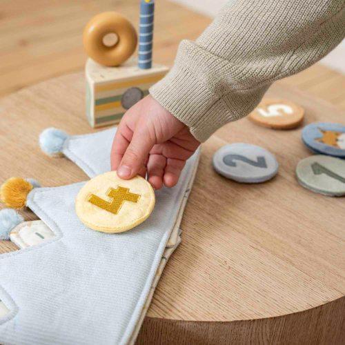 Hip hip hooray! Celebrate your birthday in style with this cute birthday crown and sprinkle some fairy-tale magic over your special day. Change the number each year from 1 to 5 so the crown grows with each milestone of your little one. Choose the birthday number, put on the crown, and capture those precious moments! Or choose the emblem with the little fox when your little one wants to be the king or queen of wonderland every day. The crown is made of soft padded and ribbed fabric in light blue, finished with colored pom-poms. Thanks to the Velcro closure, the crown grows with your child. Watch how proudly your little one wears the crown and shows their age with every smile and giggle. Happy birthday!
