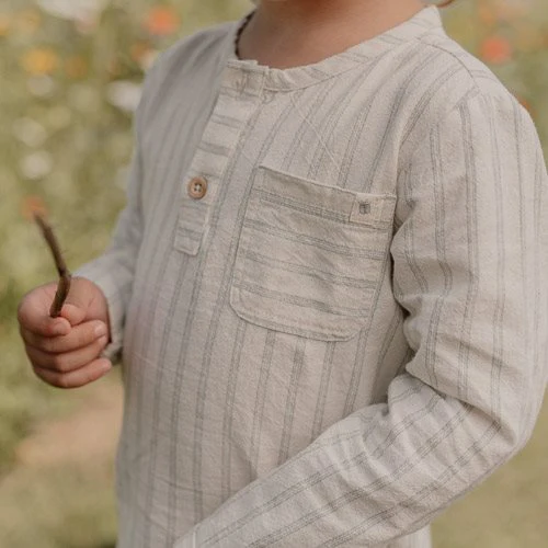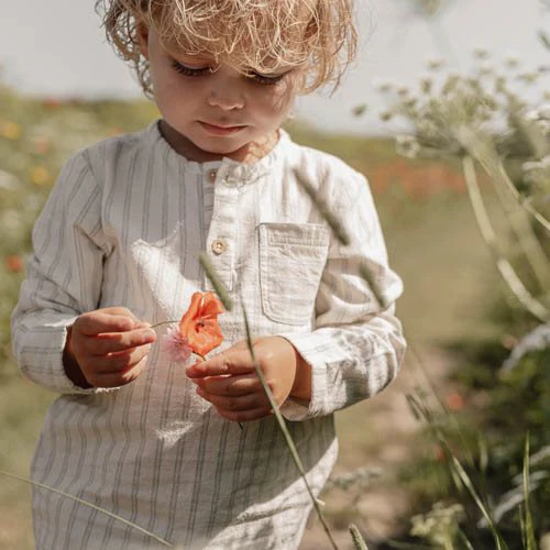 Dressed for a new adventure! This beautiful linen-look shirt features a refined Forest Green stripe pattern. Made from organic cotton and equipped with a playful chest pocket at the front. The rolled-up sleeves provide a casual yet polished look, perfect for both playful and formal occasions. The wood-look button closure adds a touch of rustic charm. It pairs perfectly with all items from the Forest Friends collection, so you’re styled from head to toe. Available in sizes 74, 80, 86, 92, 98, and 104.