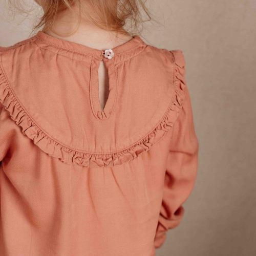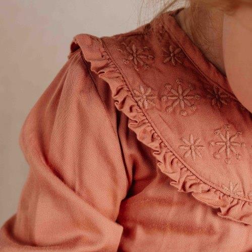 The warm pink color and playful design of this cute blouse get you ready for a new season. Made from soft and smooth organic cotton, this blouse offers both comfort and style for your little one. The neckline is finished with cute floral embroidery. The sleeve ends are elastic and have a cute ruffle. This lovely warm pink blouse pairs perfectly with other items from the complete Farm collection. Available in sizes 74, 80, 86, 92, 98, and 104.
