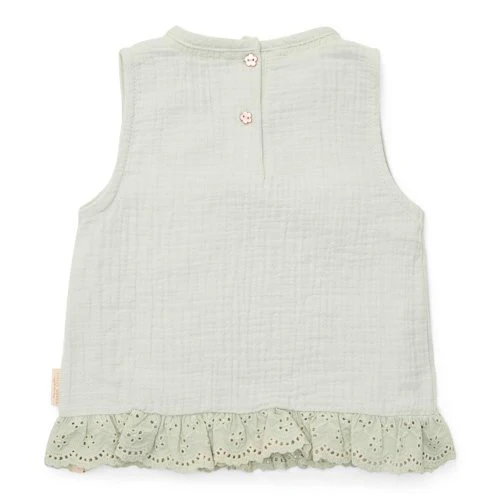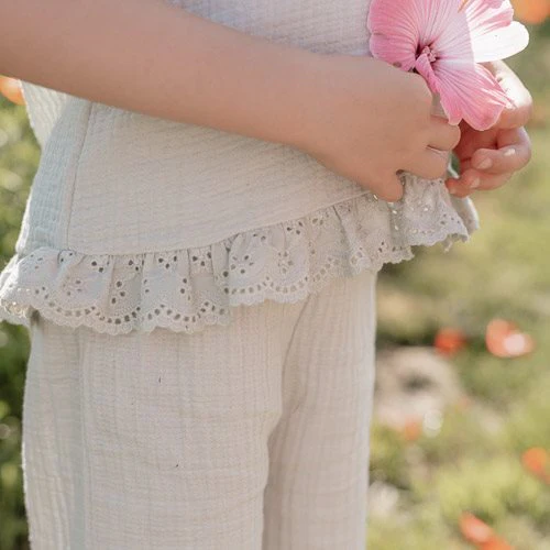 Step into a garden full of flowers and enjoy the enchantment of colors and scents. This beautiful blouse, made of light muslin fabric, is perfect for outdoor play on warm spring and summer days. Made from comfortable organic cotton in the color Fairy Mint, it features charming floral embroidery on the front. But the real magic lies in the lace ruffles along the bottom of the shirt. With every turn and twirl, your little one feels like the star of a magical fairy tale. Choose a co-ord set with the matching wide pants or mix and match with any other item from the Fairy Garden collection. Available in sizes 74, 80, 86, 92, 98, and 104.