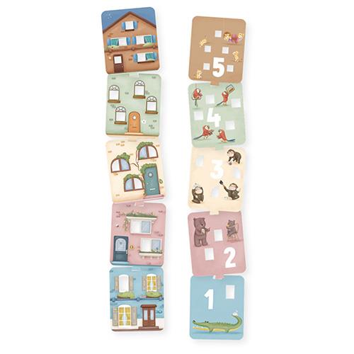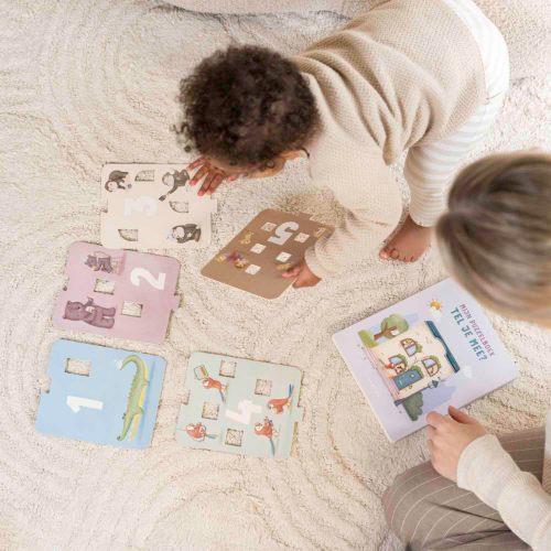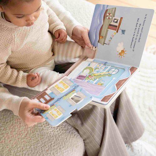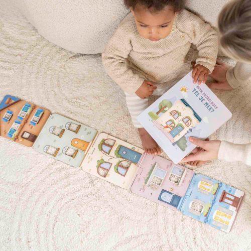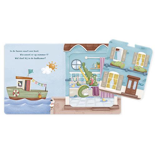 In this puzzle book, there is all sorts of things to see and count. Who lives in the houses at numbers 1, 2, 3, 4, and 5? How many windows do you count in each house? Try counting how many dogs are playing. The houses are located in different places: by a harbor, a canal, a square, a park, and there is a house with a large garden. There is not only a lot to see outside. Look through the windows of the houses inside. What are the residents doing? The puzzle pieces are printed on both sides. If you take the puzzle pieces out of the book, you can make one big house with all the pieces. Or make a number tower with the back of the pieces. Will you puzzle along?