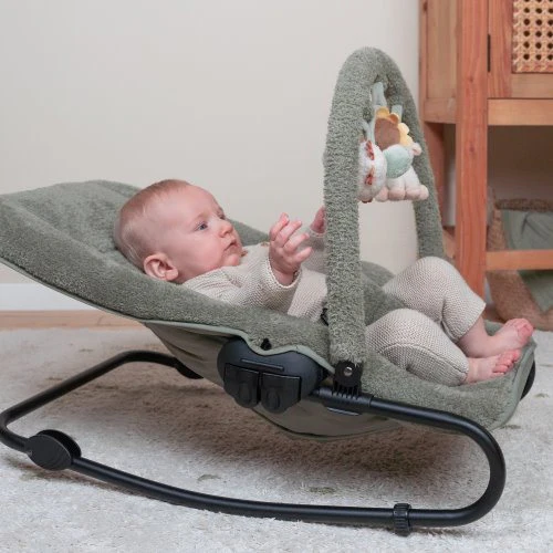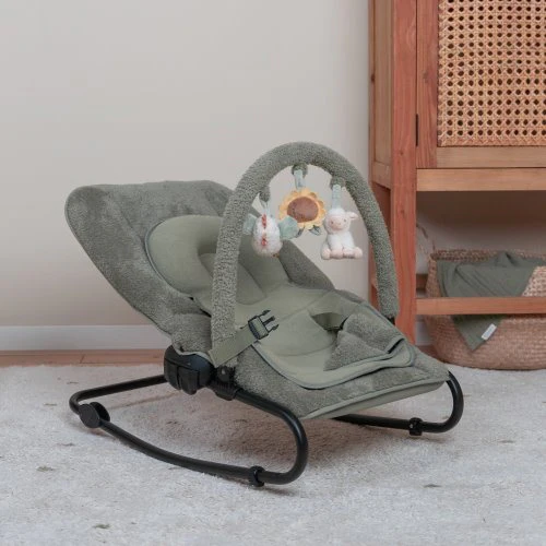 The bouncer offers your child a comfortable place to relax and play. Your child is safe in the 3-point safety belt and can play for hours with the toys on the play bracket. Thanks to the swing frame, the rocking chair starts wiggling with a small movement of your child. Both the backrest and the footrest are adjustable. The chair is supplied with a reduced cushion and an adjustable play arch. There are a chicken, a sunflower and a sitting sheep on the play arch. The backrest is adjustable in various positions and the seat can be used in both a rocking position and a fixed position. The bouncer is suitable for your child from birth to 6 months (approximately 9 kg) your child can be comfortable in the seat.