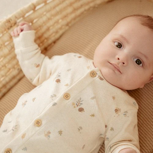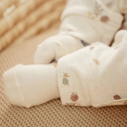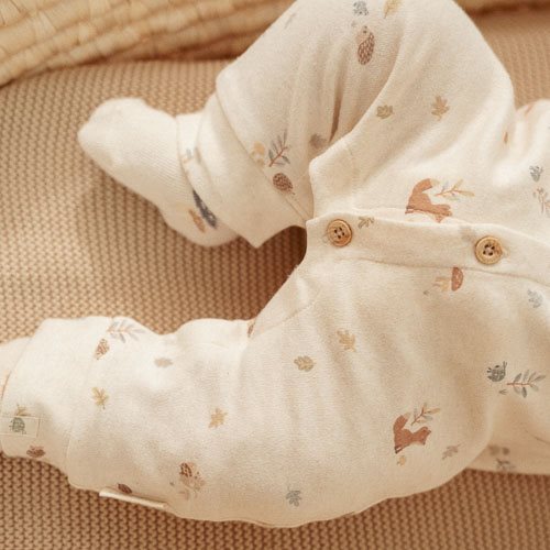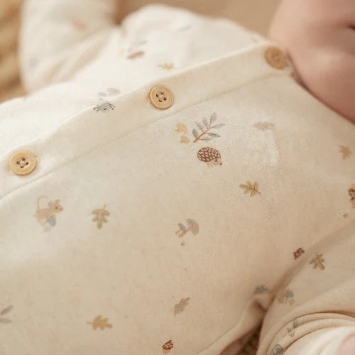 Enjoy loving moments in Forest Friends style! This cute jumpsuit in a sand-colored melange features the enchanting Forest Nature print with adorable little foxes, surrounded by a forest full of mushrooms and leaves. To easily change diapers and dress and undress, it has a snap button opening at the crotch and front. Made from soft, organic cotton, it ensures a comfortable fit for your little one. Pair with a bodysuit for a coordinated look or mix and match with other items from the Forest Friends collection. Available in sizes 44, 50, 56, 62, 68, and 74.
