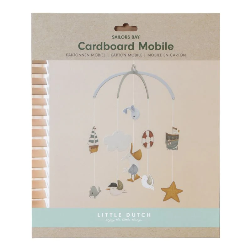 Look up and admire the scene of Sailors Bay! Do you see the seagull? There is also a sailboat! Will the pelican catch the fish? There are 10 cardboard figures to discover and admire. It is not only a beautiful decoration for the nursery, but the cute baby mobile also stimulates visual development and provides a sense of peace and calm. Note: does not contain music.