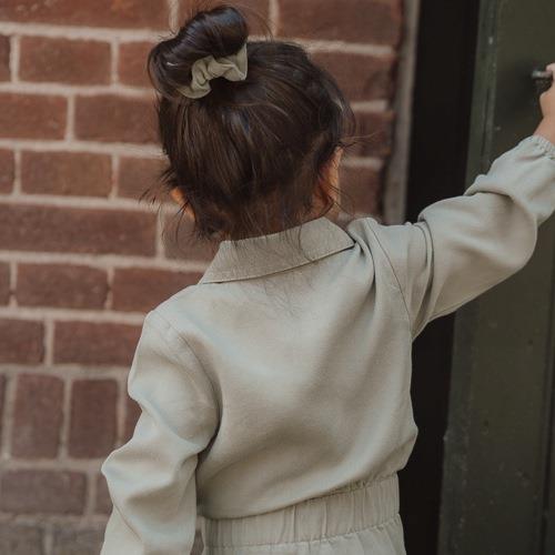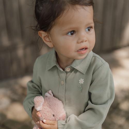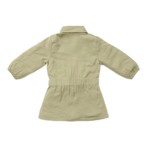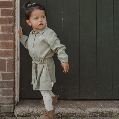 This soft green dress is made from naturally soft Tencel fabric for a comfortable fit. The dress features wood-look buttons at the front, elasticated cuffs, and an elastic waistband with a matching belt. A small floral embroidery at the front adds a nice natural detail to the dress. Pair with some tights for extra warmth and complete the look with a matching scrunchie from the complete Farm collection. Available in sizes 74, 80, 86, 92, 98, and 104.