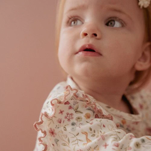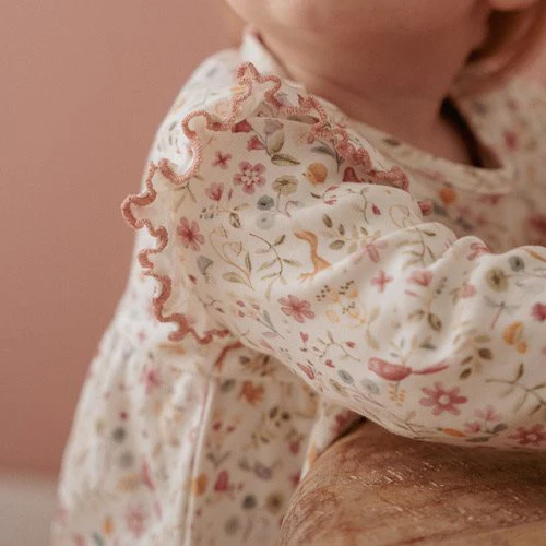 Dream away in a fairy tale of the Fairy Garden! This enchanting dress is made of soft, comfortable fabric and features a design of a magical garden full of flowers, leaves, squirrels, hedgehogs, birds, and more. The charming design has cute ruffles on the shoulders, and the elastic ends of the sleeves are adorned with an extra ruffle for a playful accent. Made from organic cotton, this dress offers your little one both comfort and style. Mix and match with other items from the coordinated Fairy Garden collection. Available in sizes 44, 50, 56, 62, 68, and 74.