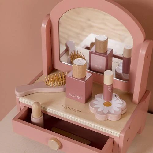 Mirror, mirror on the wall. This pink wooden dressing table for children encourages imaginative play and provides endless fun. The dressing table features a rotating mirror and 6 wooden beauty products, such as a hairbrush, lipstick, perfume, eyeshadow, nail file, and nail polish. The dressing table also has a storage drawer to keep headbands, elastics, and clips (not included). Suitable from 3 years old.