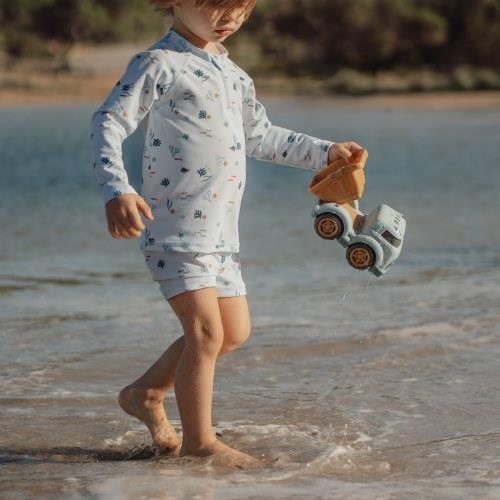 With its large wheels, this tough dump truck drives effortlessly over any type of terrain. In its cargo bed, the Ocean Dreams Blue toy truck easily transports loads of soil, sand, stones, or shells across the beach or through the garden. A fun toy car for indoors and outdoors!