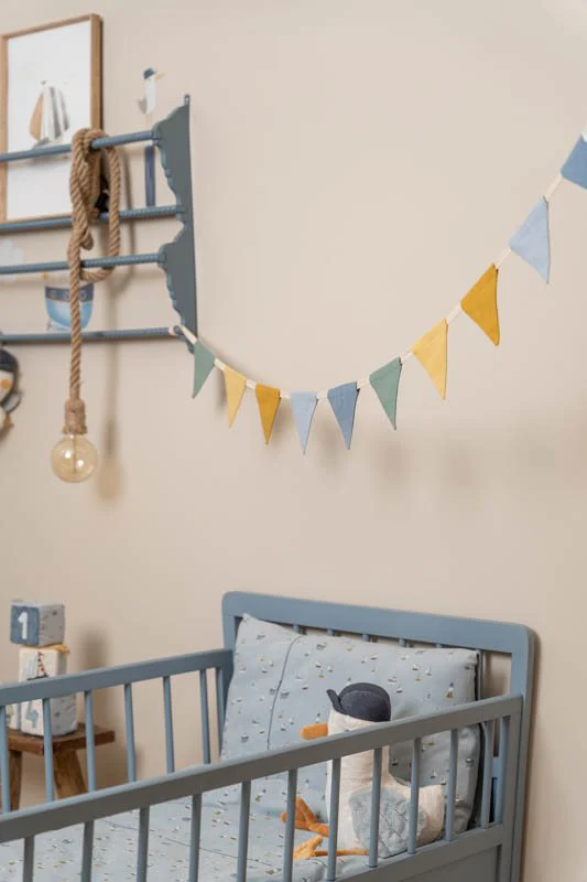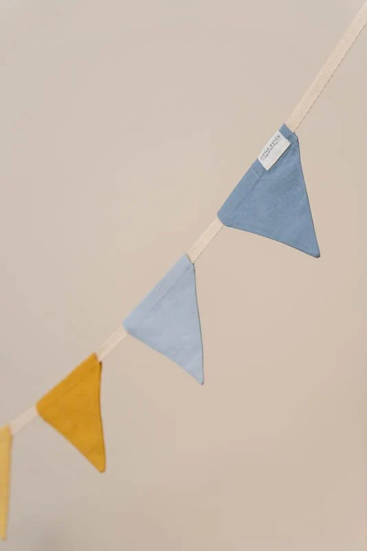 Brighten up the nursery with this beautiful bunting of flags. Who says bunting is only for parties?! They instantly brighten up a room. On the wall, around the mosquito net, on a bookshelf, or as decoration for a play tent. Get creative with this charming fabric bunting in the soft and playful colors of light blue, blue, yellow, ocher, and green.