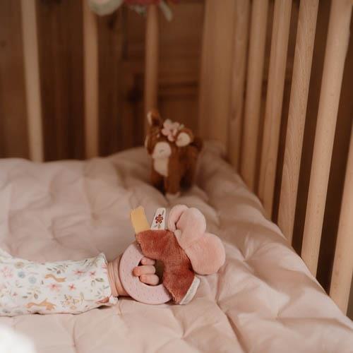 Our favorites from the Fairy Garden collection together make a perfect maternity gift or baby shower present. This beautiful box contains three soft products for sleeping, cuddling, and playing. The cuddle cloth with a soft bird is wonderful for cuddling, but also fun for a game of peek-a-boo. The cuddle deer is always ready for a big hug and adventures full of play and imagination. This set also includes a teething ring for soothing when teeth are coming through. And the cute flower on the ring stimulates hand-eye coordination and the curiosity of little ones. The three products are packaged together in one beautiful gift box.