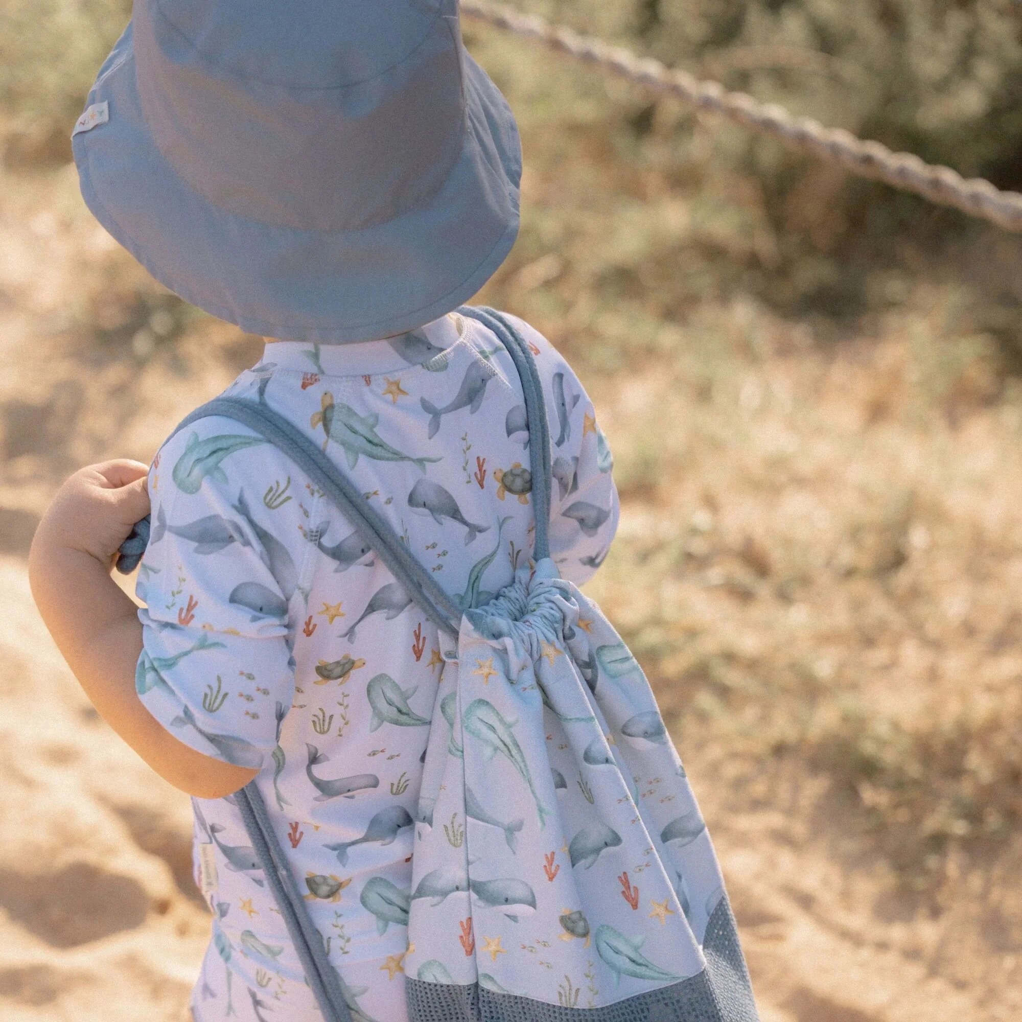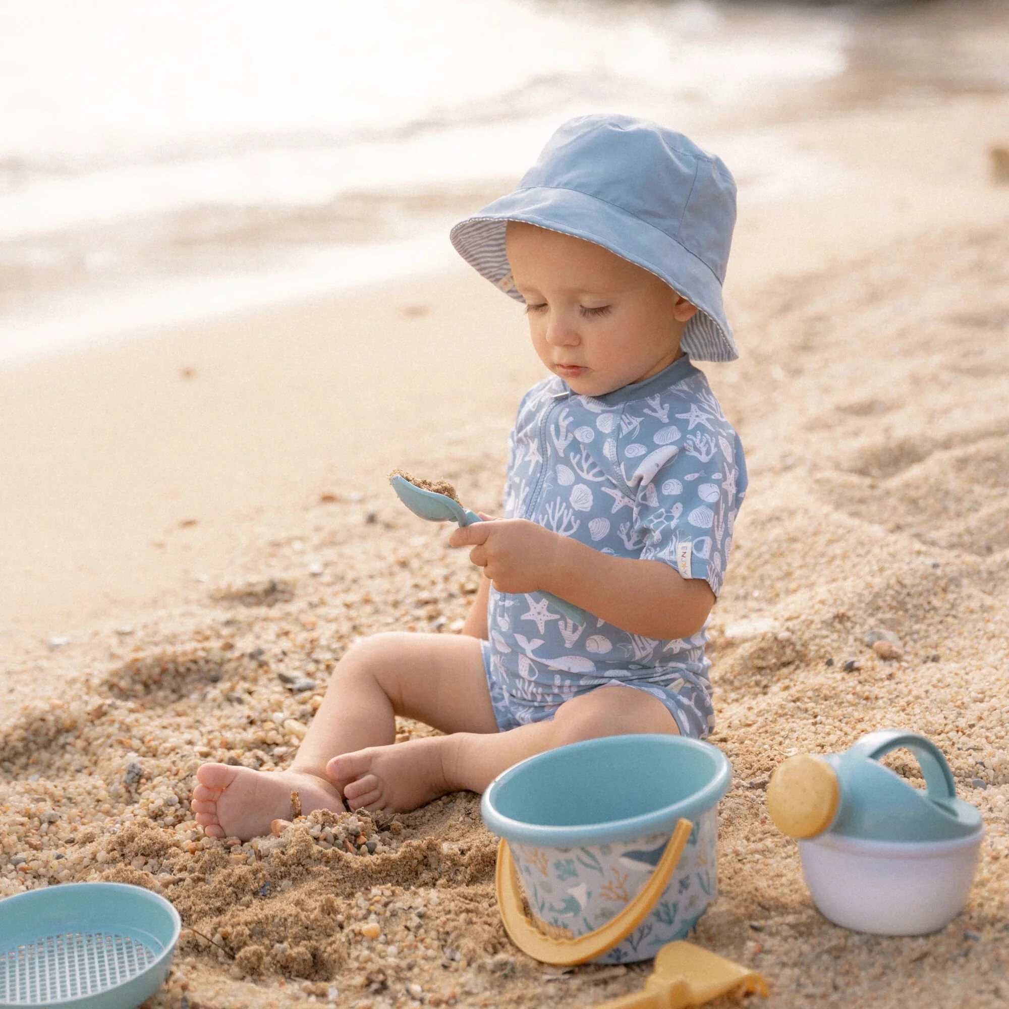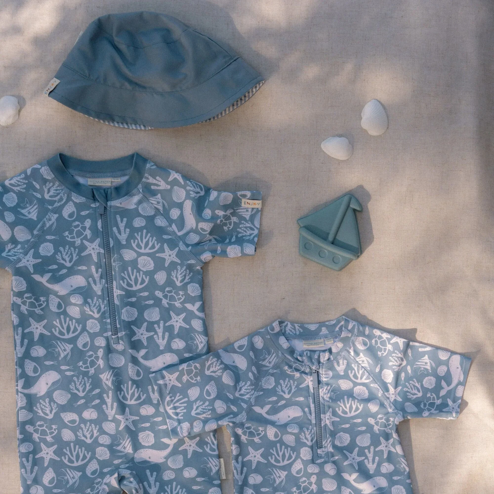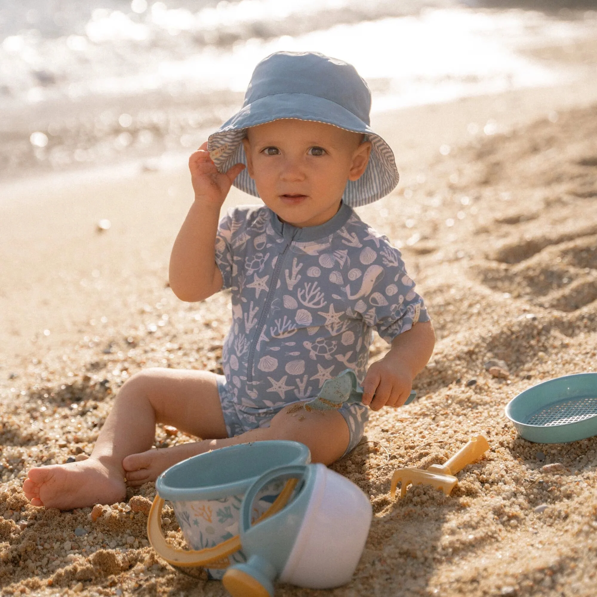 Sunshine calls for a sun hat! With this versatile fisherman’s hat, you can enjoy playing outside without worries. It protects you from the sun and, thanks to the two different styles, the sun hat matches any look.This cute bucket hat is both practical and comfortable. Choose the neutral blue side, or turn the hat inside out for a striped, casual look with a cute detail of two small fish. The wide brim characteristic of a bucket hat provides shade for the face and neck, keeping your little one cool and protected. The hat is available in three sizes.Whether you’re going to the park, the beach, or attending an outdoor activity, this hat is essential to always bring along on sunny days. Pair with the Ocean Sea Life swimsuit and swim shoes for a fashionable look. Don’t forget to always use sunscreen to protect your little one.