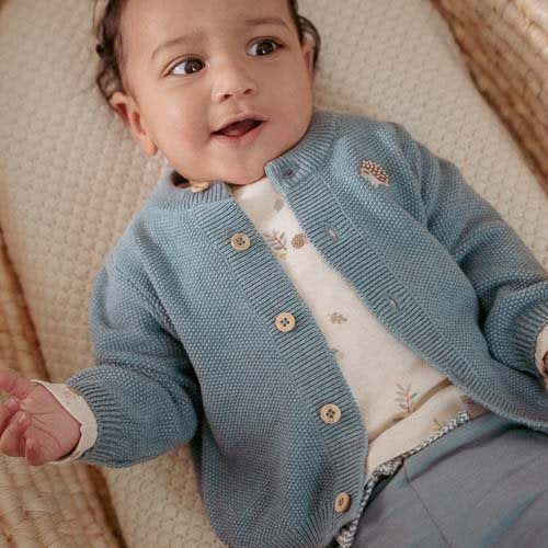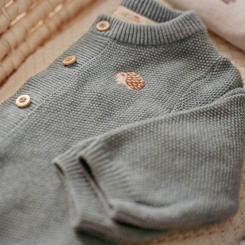 Hey there, Baby Blue Beauty! Wrap your little one in warmth and style with this knitted cardigan. Made from a soft marled blue knit, this cardigan offers warmth and comfort for your little baby. The charming embroidery of a hedgehog on the chest adds an extra layer of enchantment. The cardigan is made from organic cotton and closes with wood-look buttons. Perfect to wear as a warm layer over the other items from the coordinated Forest Friends collection. Available in sizes 44, 50, 56, 62, 68, and 74.
