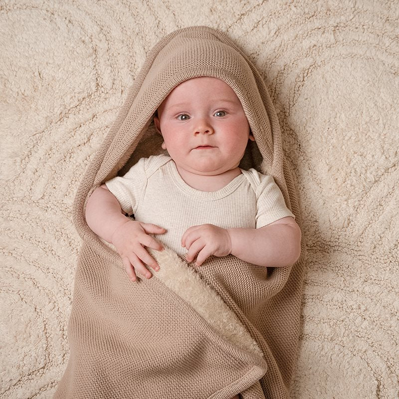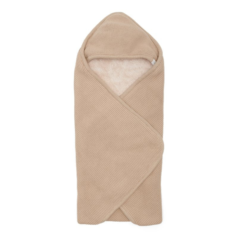 The outside of the wrap is made from 100% organic cotton. Due to its size of 75 x 75 cm, you can use the wrap during feeding, on the go, after a bath, at the consultation office, etc. This keeps your baby nice and warm. The wrap has an opening, so it can also be used with the belts of the car seat and/or bouncer. This way, your baby stays wonderfully warm both on the go and at home.