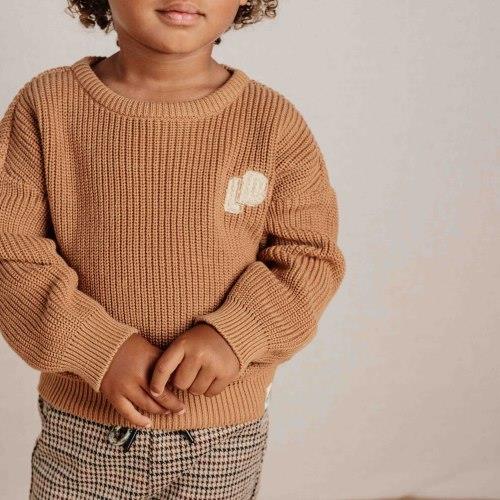 A timeless look with this knitted brown sweater, made from organic cotton. All items within the Farm collection are carefully coordinated, allowing you to endlessly mix and match. Available in sizes 74, 80, 86, 92, 98, and 104.