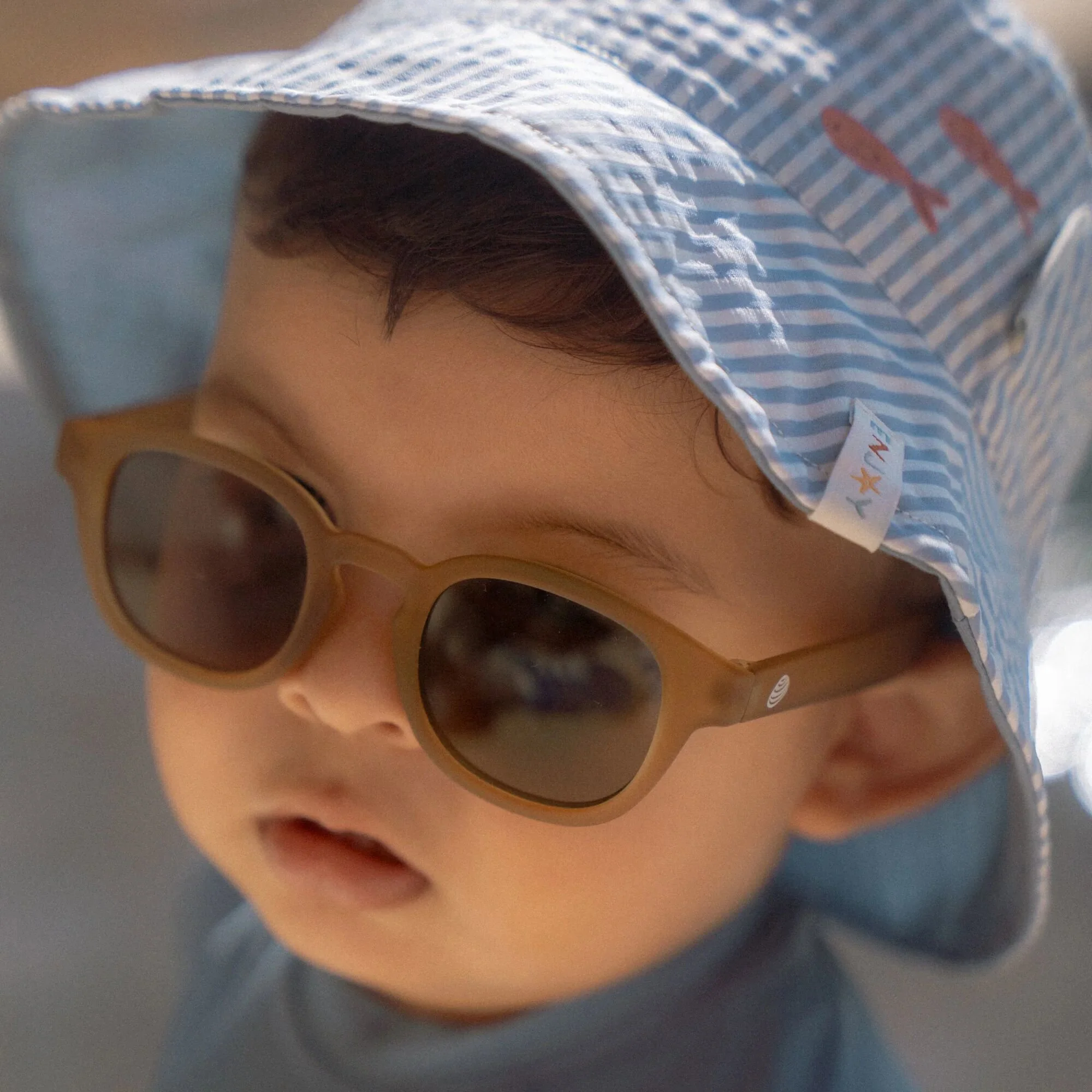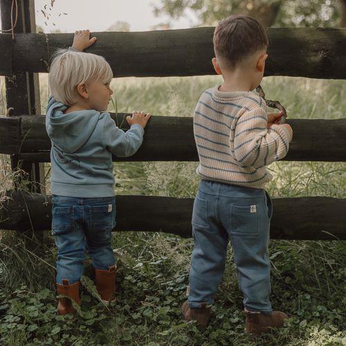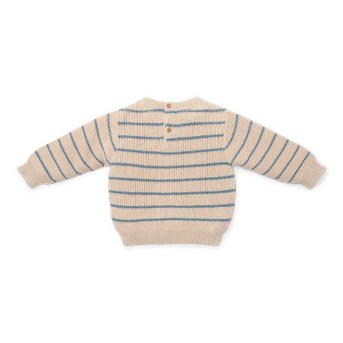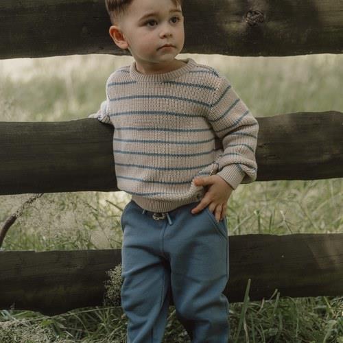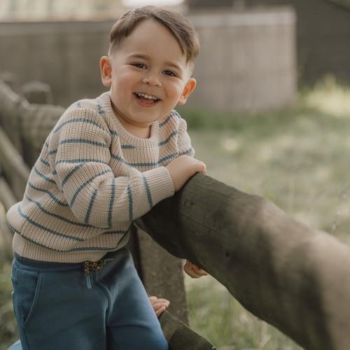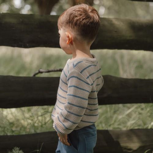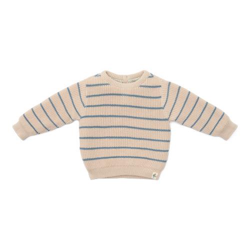 Stripes! This knitted sweater in a sand color features subtle ice blue stripes. Made from organic cotton for comfort and style, this sweater is perfect for keeping your toddler warm during cold days. All items within the Farm collection are carefully coordinated, allowing you to mix and match endlessly. Available in sizes 74, 80, 86, 92, 98, and 104.