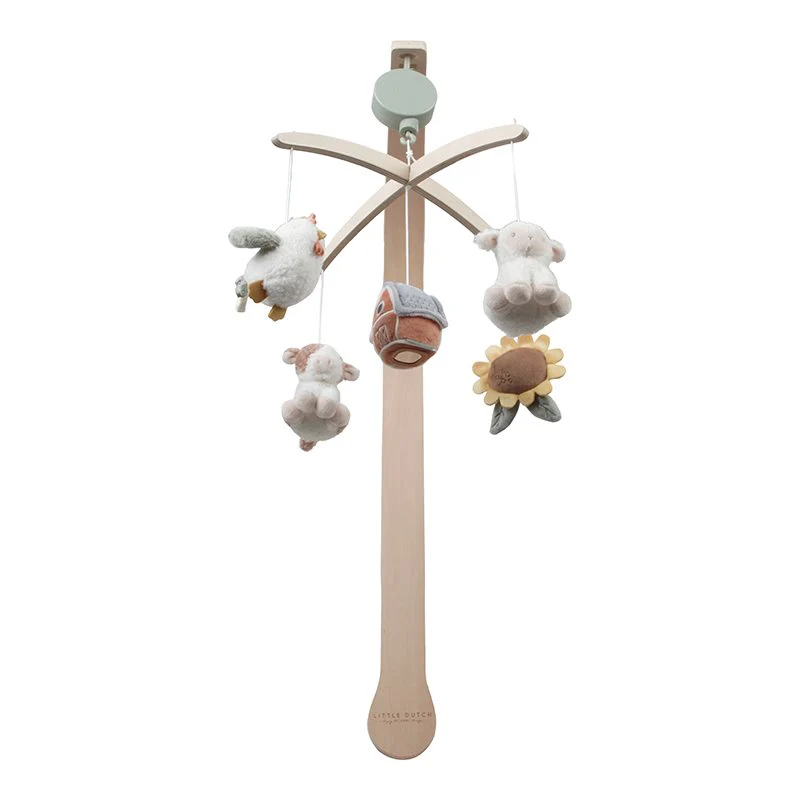 This beautiful wooden Little Dutch music mobile is soothing for babies thanks to the sweet lullaby. Five toys from the Little Farm collection hang from the mobile. Babies love to watch the movement of these toys, which stimulates their visual development. The music mobile is suitable from birth and easy to attach to the crib or playpen. WARNING: Attach this toy out of the child’s reach. To prevent the child from getting entangled and injured, remove this toy when the child starts crawling on hands and knees. To be assembled by an adult.