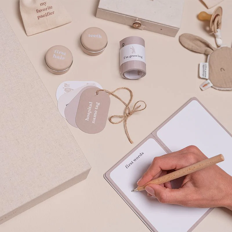 Preserve the memories of your child in this luxurious linen Little Dutch memory box Newborn Naturals. This memory box offers many ways to preserve memories of important milestones in a personal and creative way. In the memory box, you will find a booklet, tags, jute twine, kraft envelopes, sticker sheet, photo corners, tin hair box, tin tooth box, Little Treasures storage box, measuring tape, storage bag for the first outfit, and a storage bag for the pacifier. How wonderful it is to later discover together the many memories and treasures that are collectively preserved in this beautiful Newborn Naturals box. On the front of the memory box is the quote ‘Little moments, big memories’.