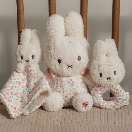 A gift full of joy! A beautiful gift box with the three most adorable miffy toys is the perfect gift for a maternity visit or baby shower. Combine miffy with Little Dutch and you get the best of both worlds: the cutest cuddly bunny there is, in the most beautiful Lucky Blossom design. The gift box contains three soft items to cuddle, snuggle, and play with. The super soft cuddle cloth provides comfort for bedtime. And the rattle is fun to play with in the playpen. All packed together in a beautiful gift box decorated with Lucky Blossom. A joy to give!