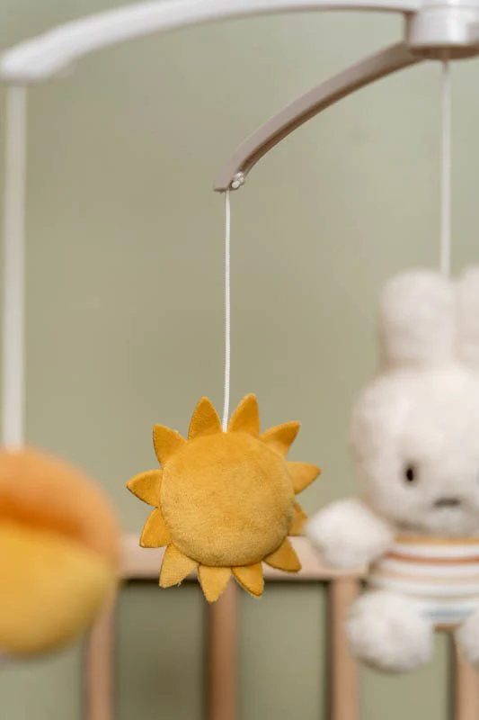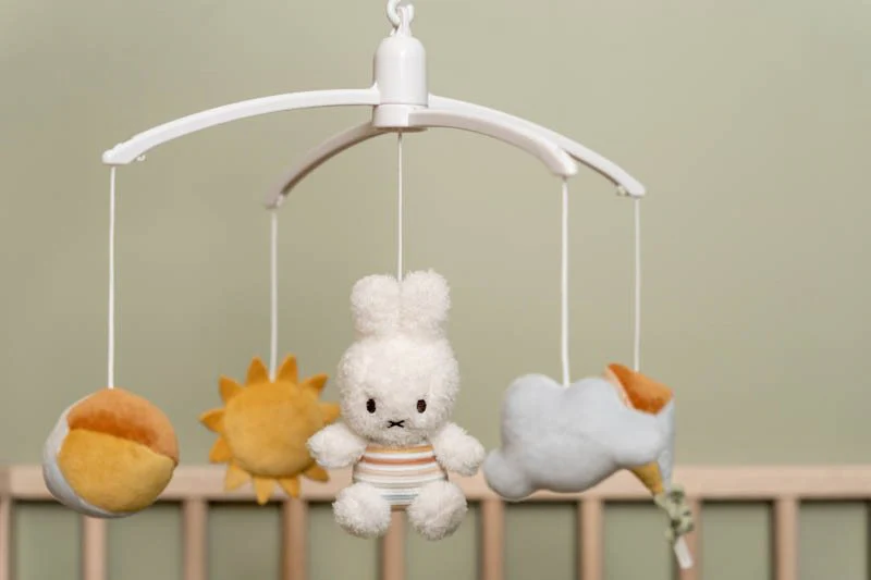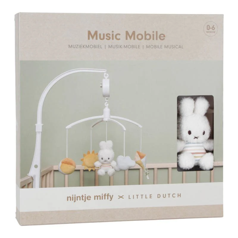 Follow miffy as the song starts playing! She is dressed in Vintage Sunny Stripes by Little Dutch and surrounded by the sun, a cloud, a kite, and a beach ball. As the whole parade circles around, you can relax to the sweet music. Wonderful entertainment for your little one that stimulates visual development. The music mobile is suitable from birth and can be easily attached to a crib or playpen.