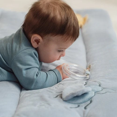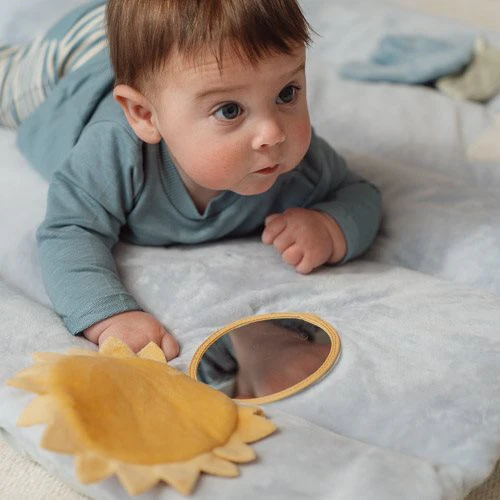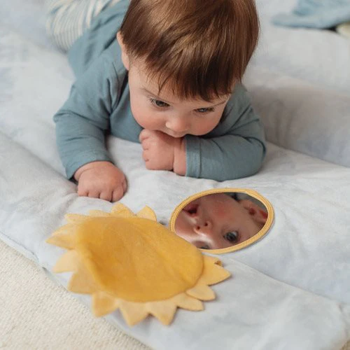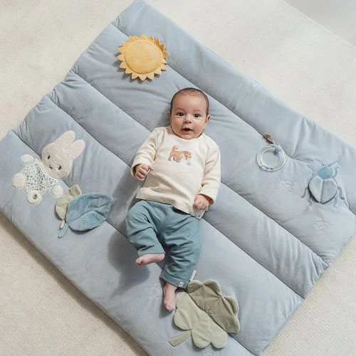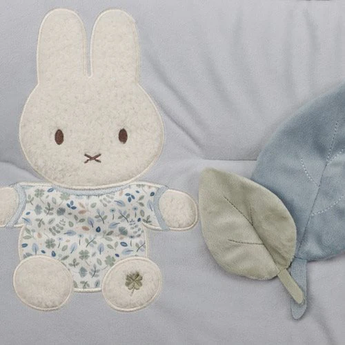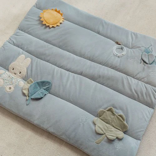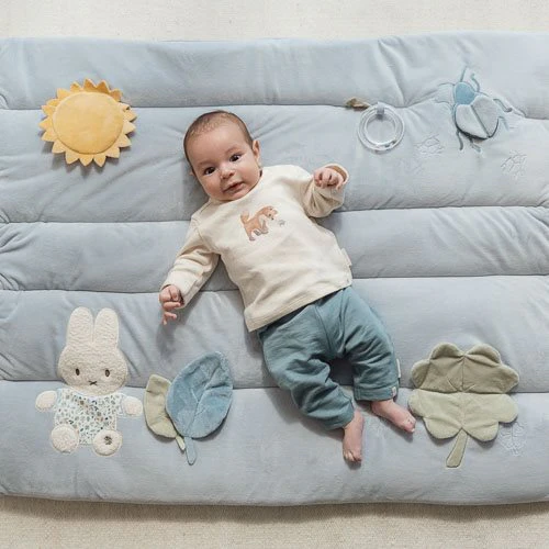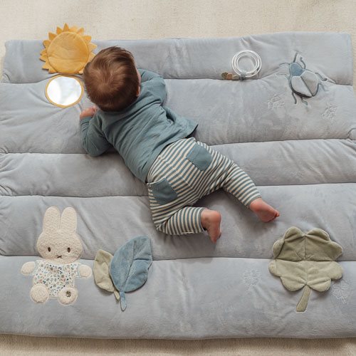 This padded play mat with miffy on it stimulates your child’s senses through the different textures and activities. There is so much to discover and see! The four-leaf clover makes a crinkling sound, there is a mirror hidden behind the sun, the little beetles are made of wonderfully soft fabric, and there are various labels to discover. There is also a ring rattle attached to the play mat. And don’t forget miffy with her Lucky Leaves outfit.