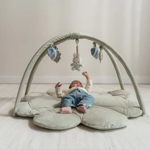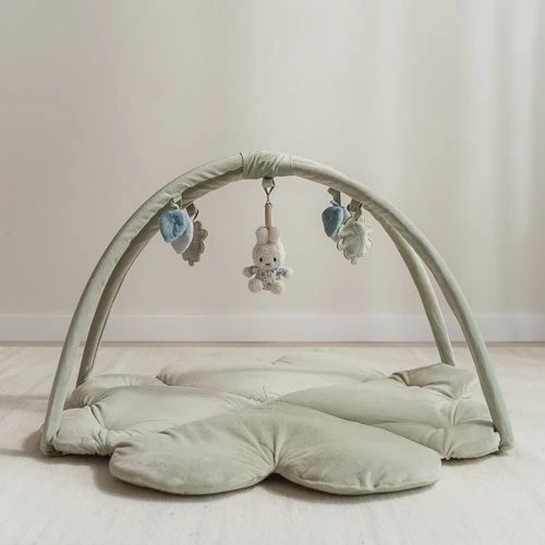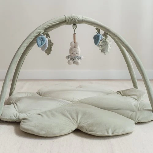 So much to see, feel, and hear! Every day is a new adventure with this clover-shaped play mat. The green mat has two large corduroy arches where five different plush toys in the Lucky Leaves theme hang. miffy, two four-leaf clovers, and two leaves help your child develop sensory skills and stimulate hand-eye coordination. WARNING: To prevent the child from becoming entangled and injured, remove this toy when the child begins to crawl on hands and knees. To be assembled by an adult.