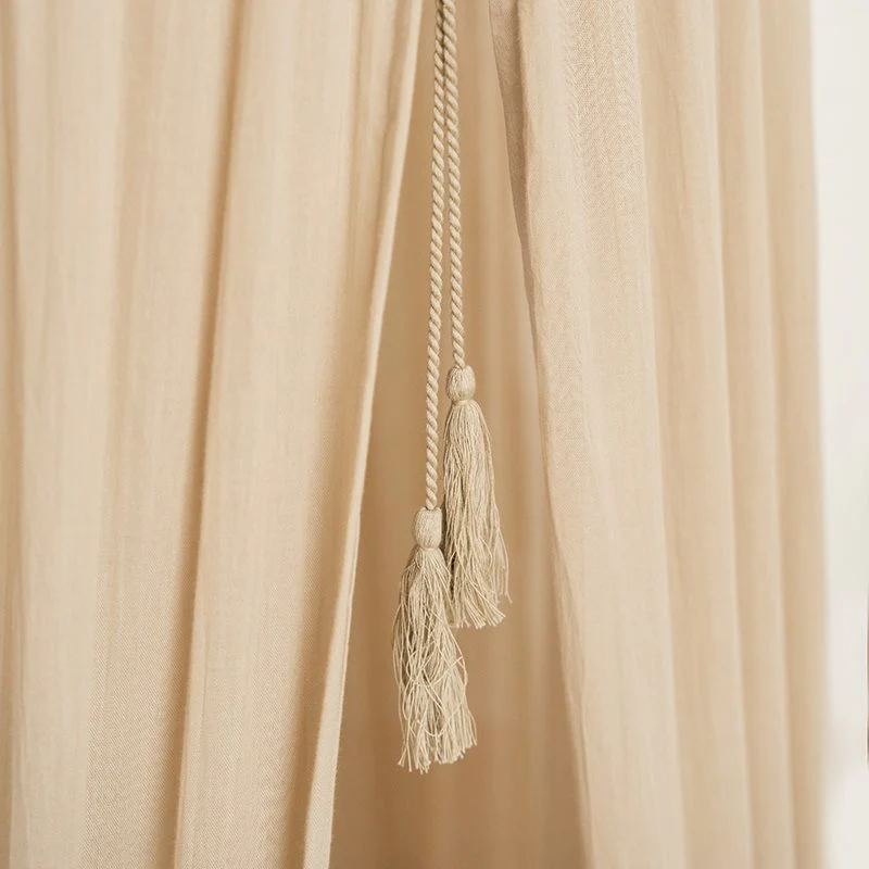 Create a cozy sleeping or playroom with this beautiful mosquito net. By hanging him on the ceiling as heaven, a baby room gets a beautiful atmosphere. The hydrophilic mosquito net gives your baby a salvaged and comfortable feeling and will make nights full of delicious dreams. Place the mosquito net above a soft play mat or rug and it turns into a magical play tent. It looks beautiful in a children’s room and your little one will love the cozy corner to play or read. The mosquito net is available in beautiful colors and combines beautifully with our textile collection and rugs. Hoop is incorporated in the light fabric and the top has a cord for simple attachment. The two small brushes give a little extra detail, but you can also decorate the mosquito net with a dream catcher, mobile or something homemade such as a pendulum. Make sure the mosquito net hangs safely and take your baby into account to prevent your child from becoming entangled in the fabric. A mosquito net is nice for a baby because it gives a secure feeling. It also looks nice in the baby’s room. The mosquito net is available in all kinds of colors, so there is always one that fits in your baby room.