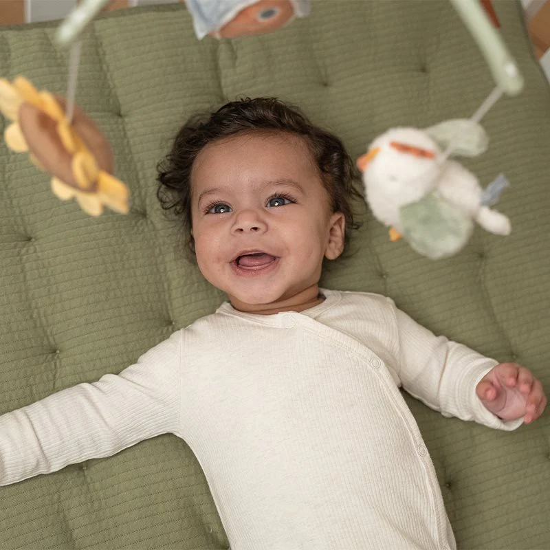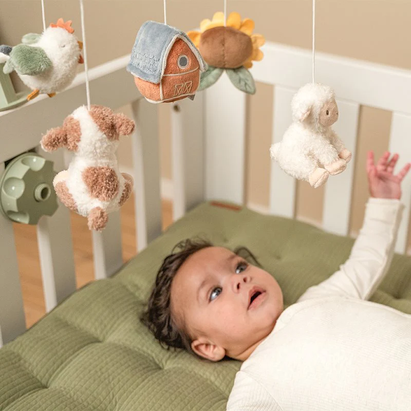 This beautiful Little Dutch music mobile is soothing for babies thanks to the sweet lullaby. Five toys from the Little Farm collection hang from the mobile. Babies love to watch the movement of these toys, which stimulates their visual development. The music mobile is suitable from birth and easy to attach to the crib or playpen. WARNING: Attach this toy out of the child’s reach. To prevent the child from getting entangled and injured, remove this toy when the child starts crawling on hands and knees. To be assembled by an adult.