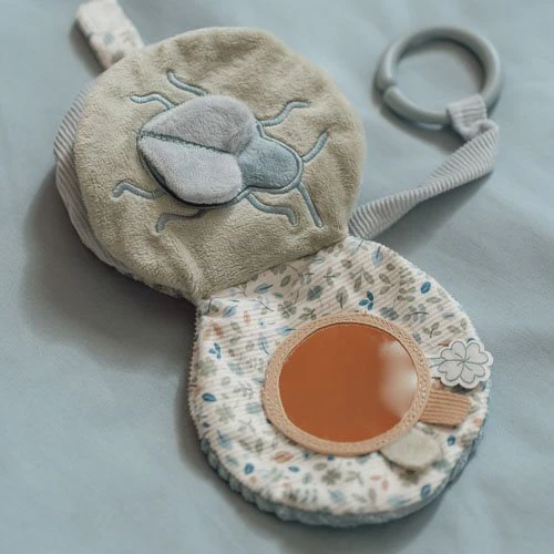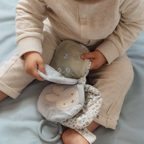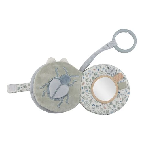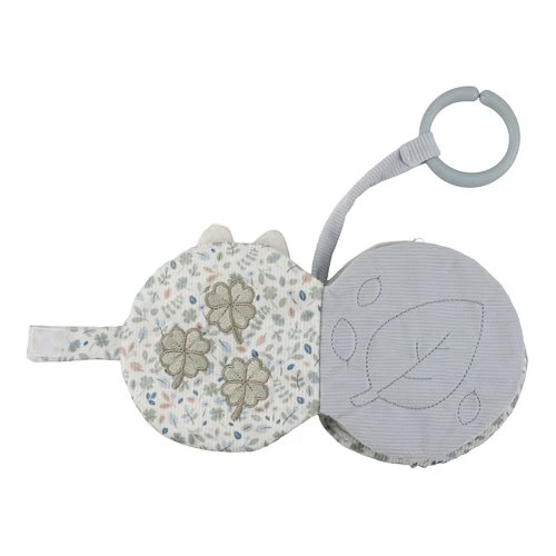 miffy entertainment on the go! This touch & play buggy book in the Lucky Leaves theme will undoubtedly become a favorite of your little one. Equipped with fun labels, crinkle textures, and sounds, this book will stimulate children’s senses. It also has a mirror for self-discovery and a soft miffy on the front. Attach the toy ring to the stroller for entertainment on the go.