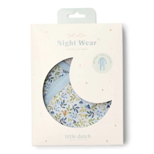 Stylishly wrapped for bedtime! This cozy onesie with wrap closure is designed for deep sleep and adventurous dreams. Made from comfortable organic cotton, it has a light blue color with a cute print of leaves, owls, and many more forest finds. The wrap design with snap buttons makes dressing and undressing easy, which is convenient for a nice bedtime routine. This pajama pairs perfectly with the matching bedding. Packed in a beautiful box, making it extra nice to give as a gift. Available in sizes 50/56, 62/68, and 74/82