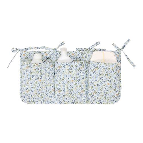 Keep all your baby’s essential items within reach with this practical organizer. Made from quilted 100% cotton with three spacious pockets. You can easily store pacifiers, wipes, bibs, diapers, cloths, toys, and more in it – everything you need to care for your little one. Simply attach it to the playpen, changing table, or wall with the strings. The Forest Adventure design with a blue background and beautiful decoration of owls, hedgehogs, squirrels, birds, and beetles.