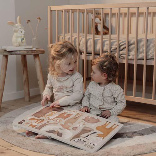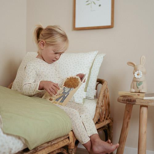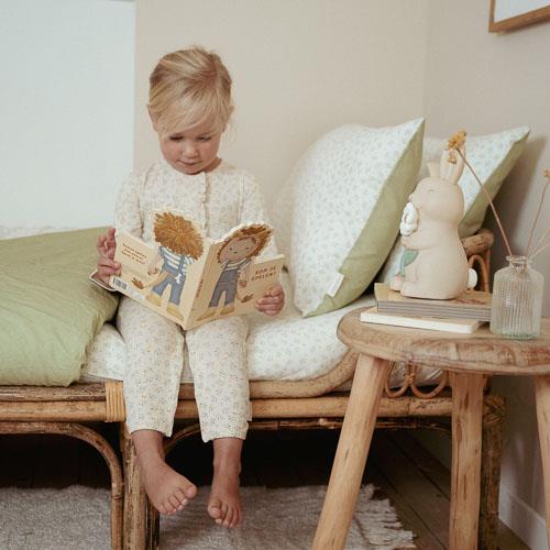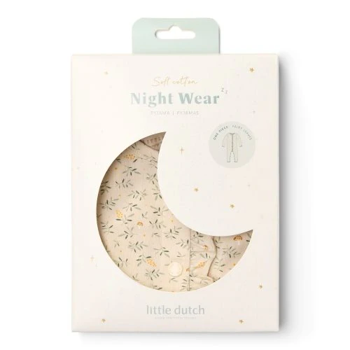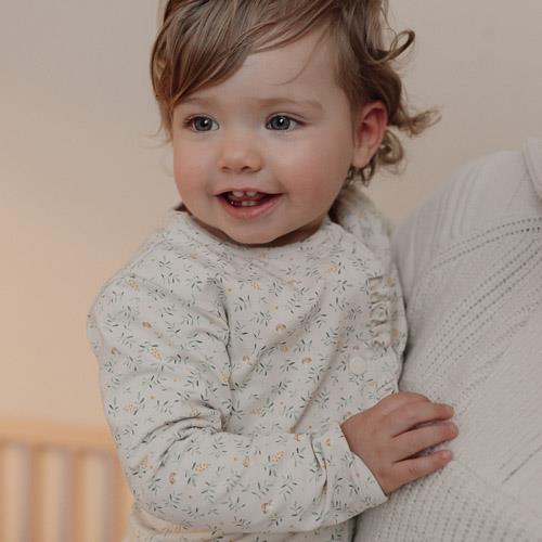 Cuddles before bedtime! This pajama is designed with comfort and style in mind. Featuring a refined print of small leaves and a charming ruffle along the closure, it combines cute design with comfort. The snap closure at the front and crotch makes dressing and diaper changing easy. Made from organic cotton, this onesie feels soft on your baby’s skin and pairs perfectly with the matching bedding. Packaged in a beautiful box, making it extra nice to give as a gift. Available in sizes 50/56, 62/68, and 74/80.