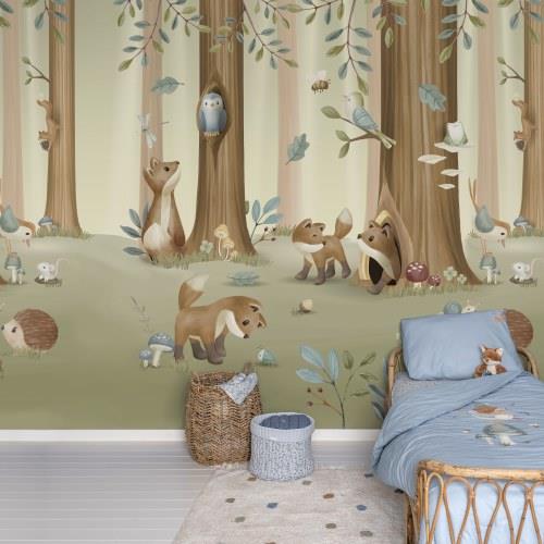 Bring the forest to life in the children’s room with our Forest Friends photo wallpaper! This beautiful digital wallpaper features a cheerful collection of animal friends, such as foxes, hedgehogs, snails, and a wise owl. Surrounded by leaves, mushrooms, and the green forest, this design creates a playful and adventurous atmosphere. Perfect for letting your child dream away in a world full of nature and adventure. The photo wallpaper is 300x280cm.