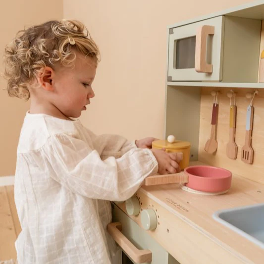 What are you cooking, little chef? Prepare the most delicious dishes in this cute wooden kitchen. Treat your family or your favorite dolls and stuffed animals to a homemade meal. With the two pans and kitchen utensils, you are ready to become a master chef! The kitchen offers everything you can imagine. You can bake a cake in the oven, cook some vegetables on the stove, and, not to forget, wash your hands in the sink. There is even a pepper and salt set and a cupboard to store your groceries. Toddlers love to mimic adults and their daily routines. This kitchen will be a dream come true for little chefs. It inspires role play, creativity, motor skills, and imagination. The sturdy wooden kitchen in modern colors creates a delightful play space in a child’s room but also looks beautiful in a living room. Combine with the scale or toaster and complete the role play.