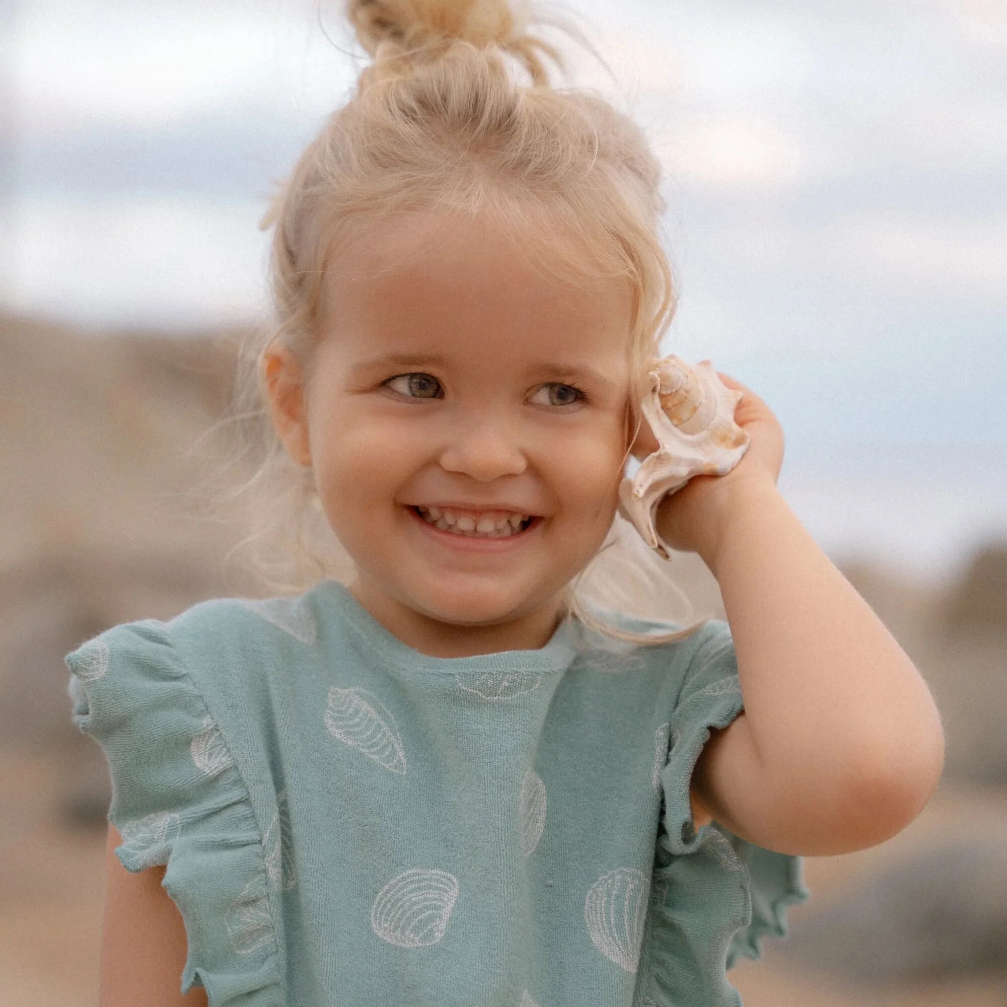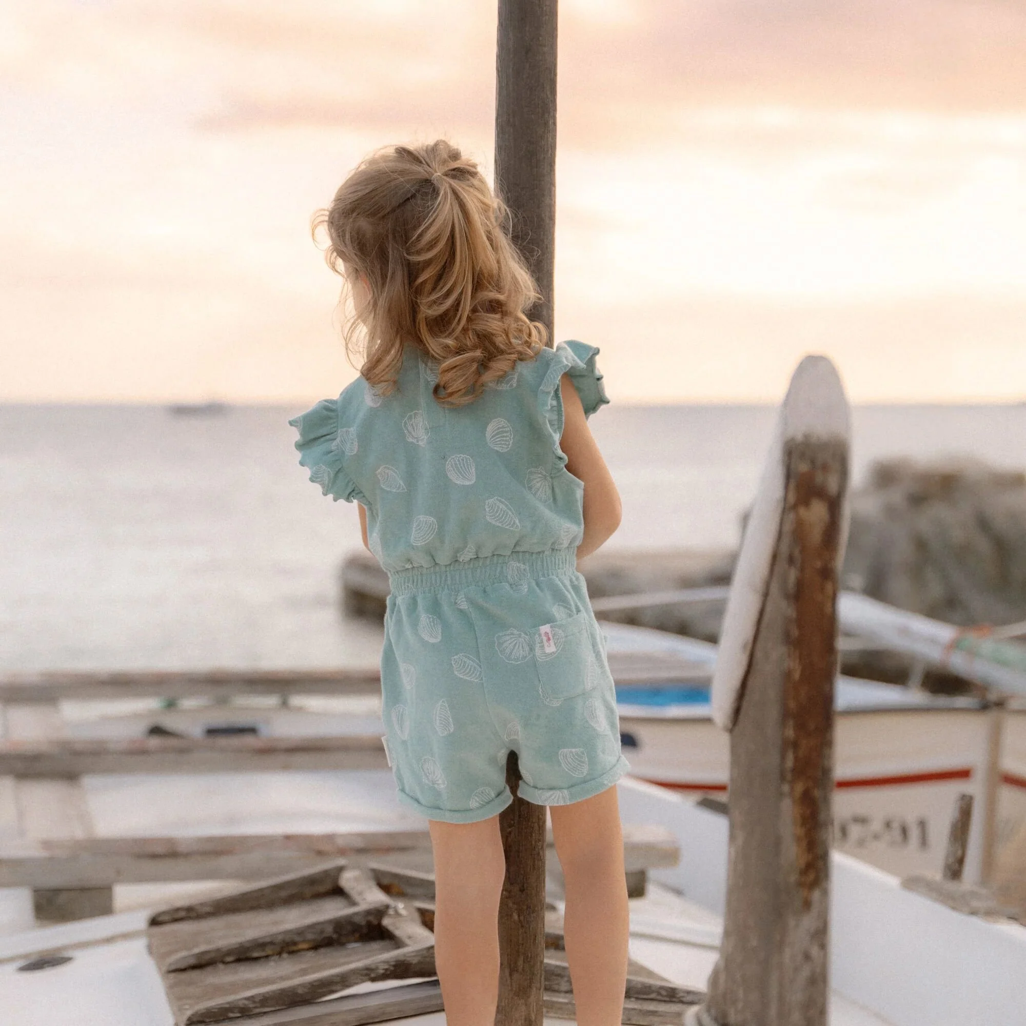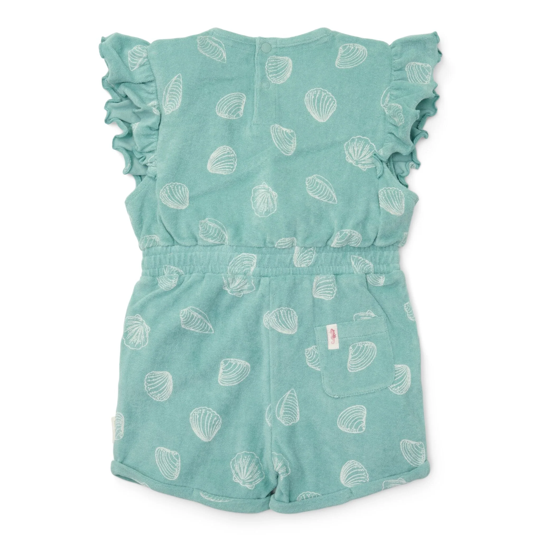 Discover the Ocean Treasures playsuit for children in the color Surf Blue. Perfect for after swimming or on a summer day, this playsuit is made from 100% organic cotton in soft terry cloth for ultimate comfort. The cheerful floral design in the theme of the collection provides a playful look. The ruffles along the body add a charming touch, making this suit a favorite for any summer activity.