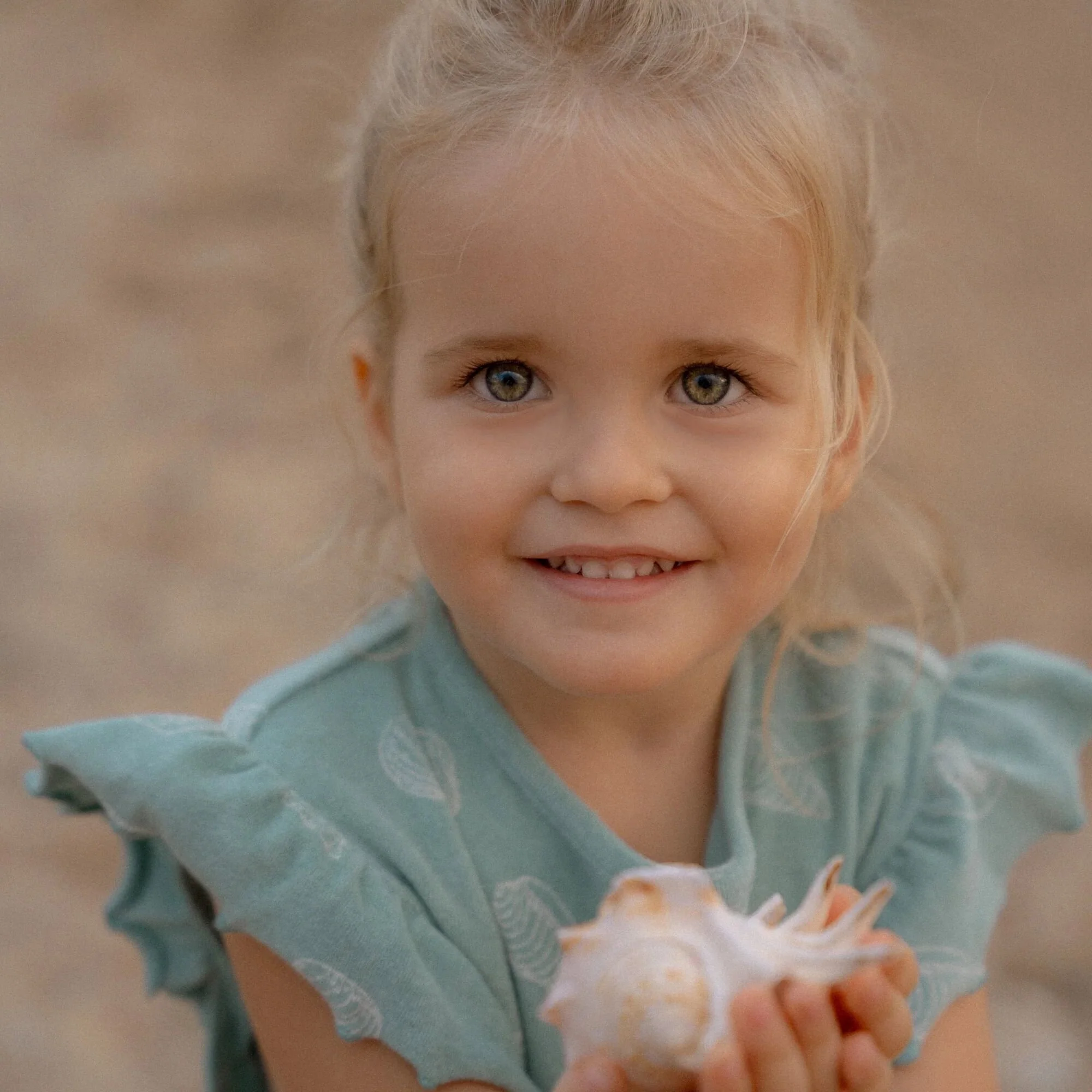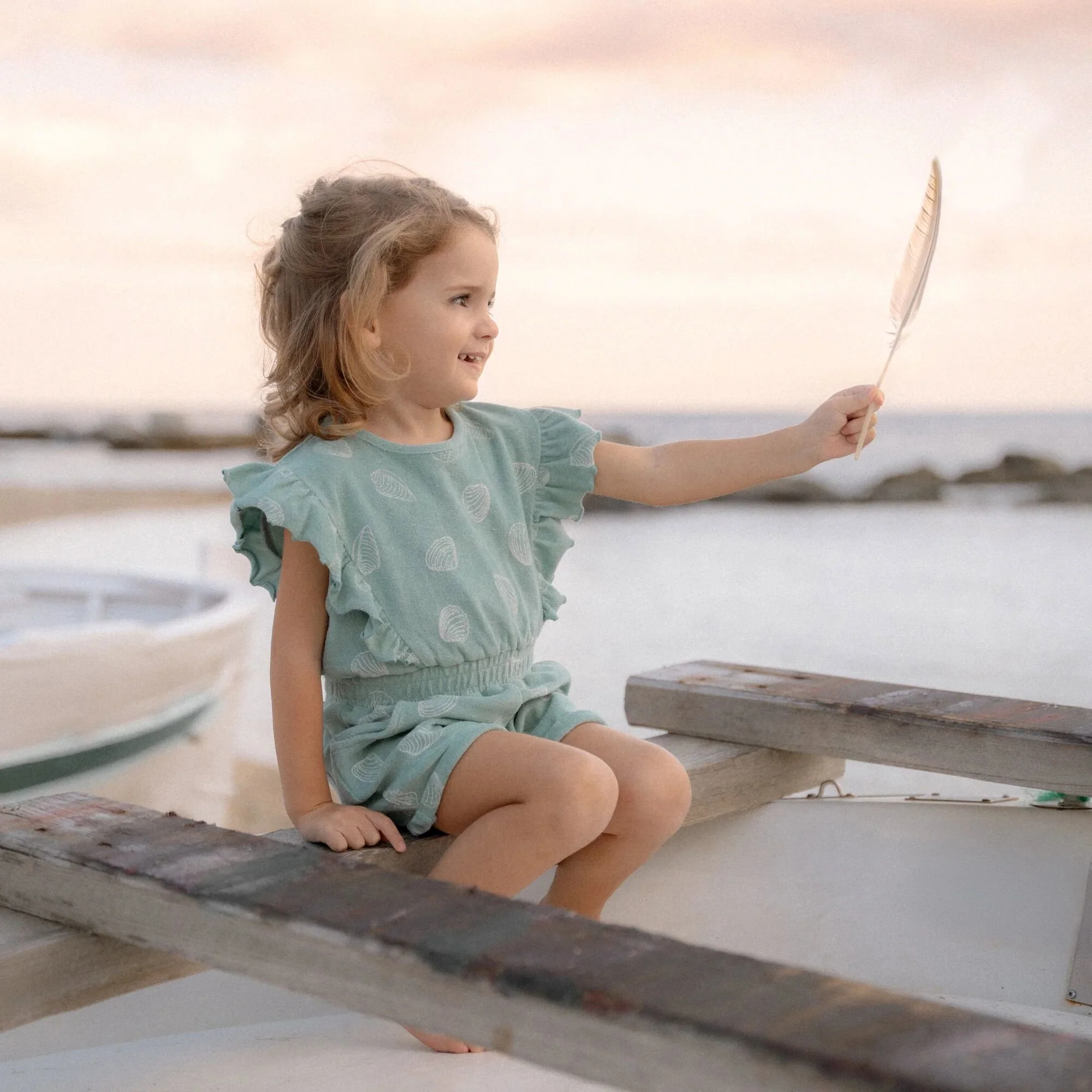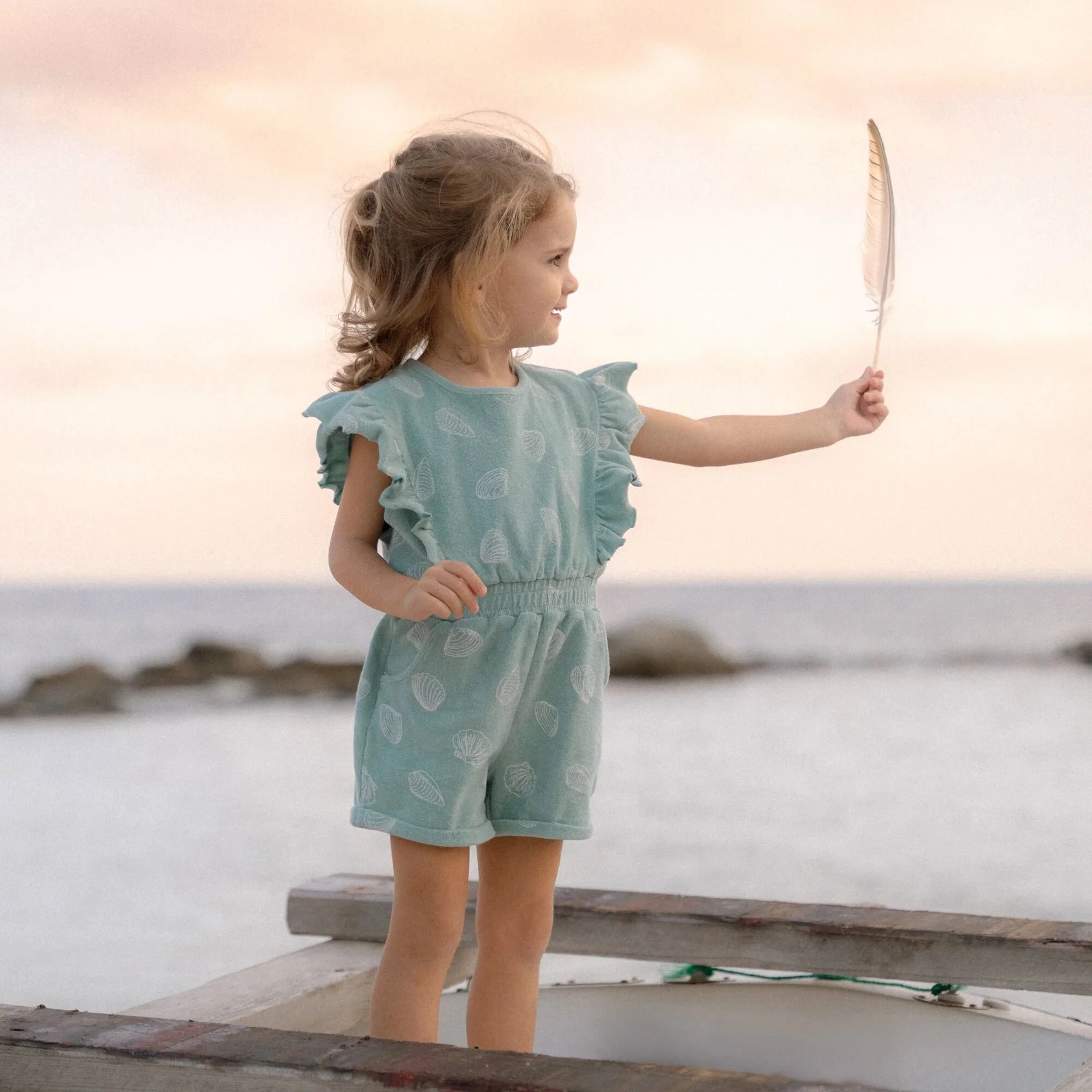 Discover the Ocean Treasures playsuit for children in the color Surf Blue. Perfect for after swimming or on a summer day, this playsuit is made from 100% organic cotton in soft terry cloth for ultimate comfort. The cheerful floral design in the theme of the collection provides a playful look. The ruffles along the body add a charming touch, making this suit a favorite for any summer activity.