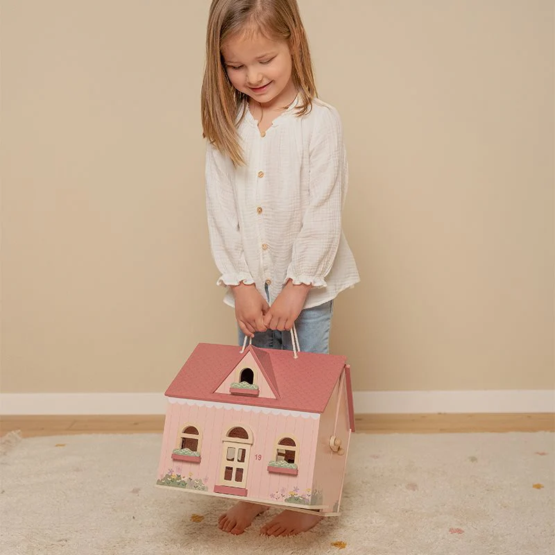 The wooden portable dollhouse from Little Dutch is a cute and cozy pink house with beautiful details. The house has a living room and kitchen downstairs, and a bedroom and bathroom upstairs. With the wooden closure, the dollhouse easily opens and closes, and thanks to the handle, it is easy to take anywhere. The furnishings are included, but there are also additional expansion sets available to further decorate the house. This dollhouse is perfect for children who love to play and fantasize with their own little world. WARNING: Not suitable for children under 3 years. Small parts. Choking hazard.
