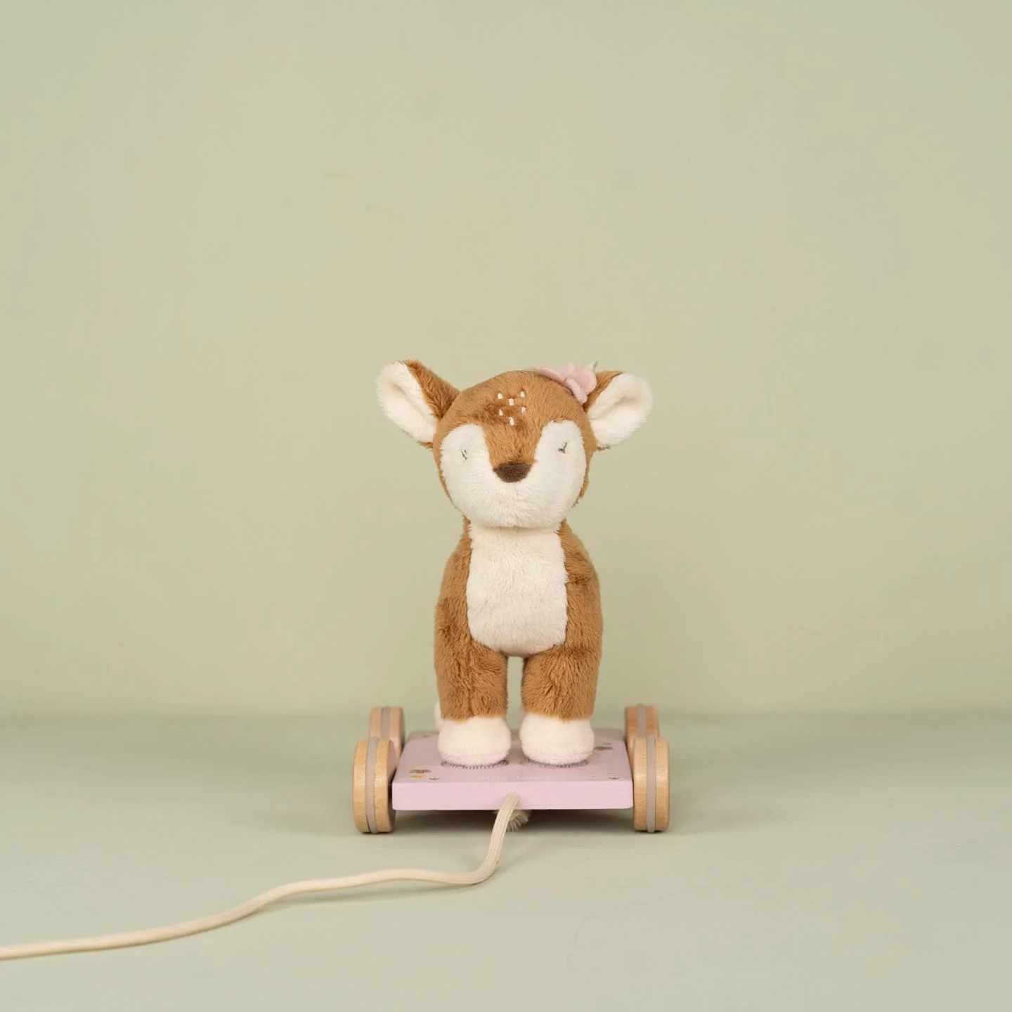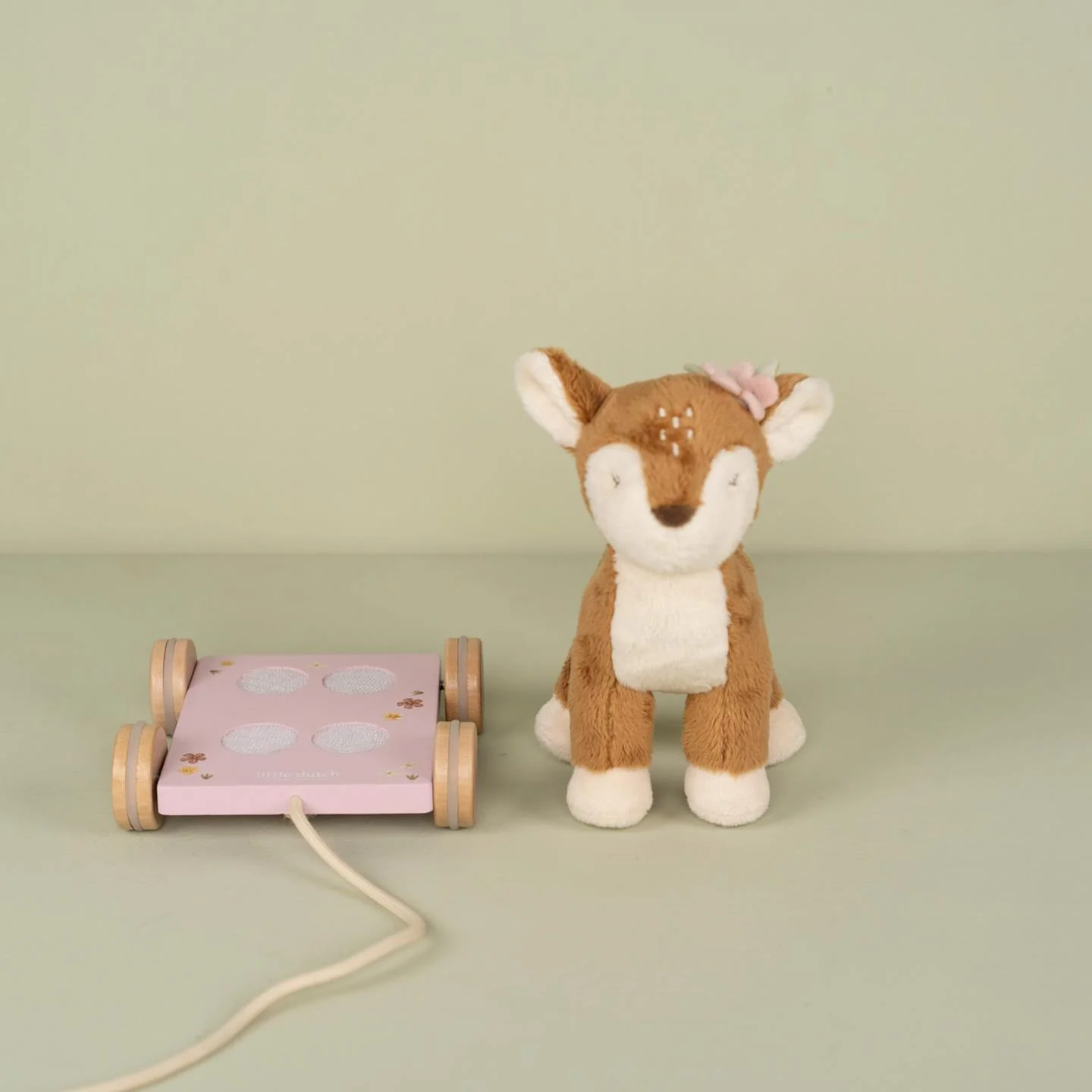 Take the little deer with you! Pull the string and go on an adventure together. The deer will follow you through the enchanting garden of Fairy Garden, where the most beautiful flowers grow and little fairies sing and dance. The soft and cuddly deer stands on a pink wooden cart decorated with flowers. With the small string, your child can show her the whole house and play delightfully. The cute pull-along animal will encourage walking and help with motor development.