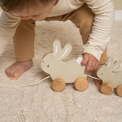 These bunnies love to join you on an exploration journey through the house. Pull the string and go on an adventure together! The pull-along animals are made of durable wood and will never tire of playing. It will encourage your child to walk and help with motor skill development.
