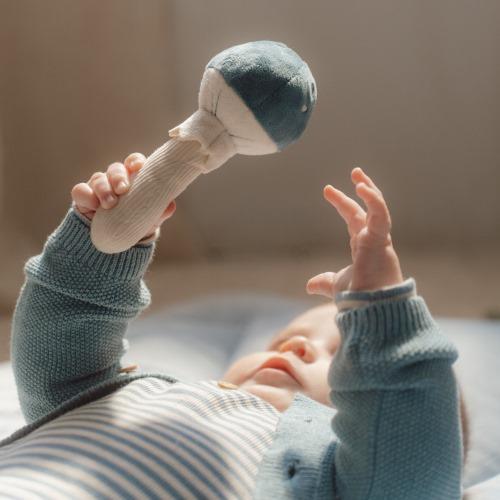 Rattle this enchanting mushroom! If you play with it you will hear a pleasant sound. The rattle stimulates hand-eye coordination, is made of wonderfully soft material and can easily be grabbed by small children’s hands.