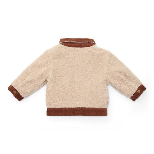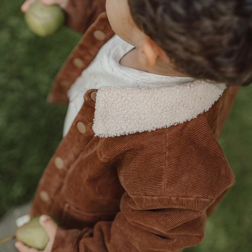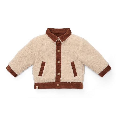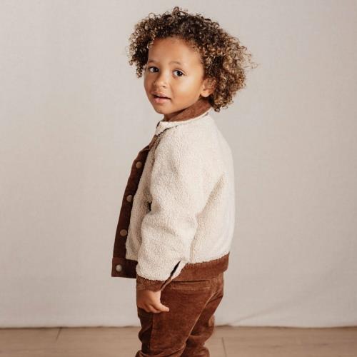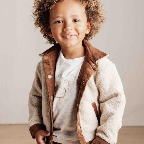 Reversible: corduroy and teddy in one! Stay warm and stylish with this comfortable and versatile reversible jacket. Designed for cozy warmth, this jacket features soft, warm corduroy on one side and plush teddy fabric on the other, giving you two cool looks in one. The jacket has pockets with an embroidered rooster and the handy snap button closure makes it easy to put on and take off. Pair it with other items from the Farm collection for a complete look. Available in sizes 74, 80, 86, 92, 98, and 104.